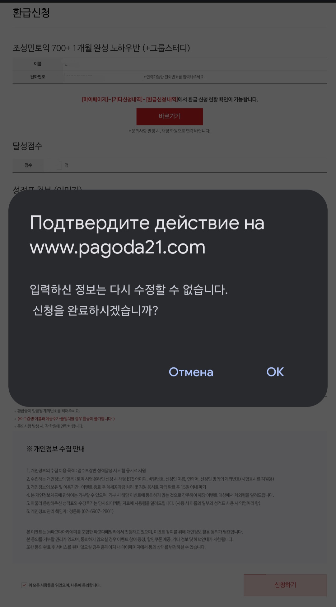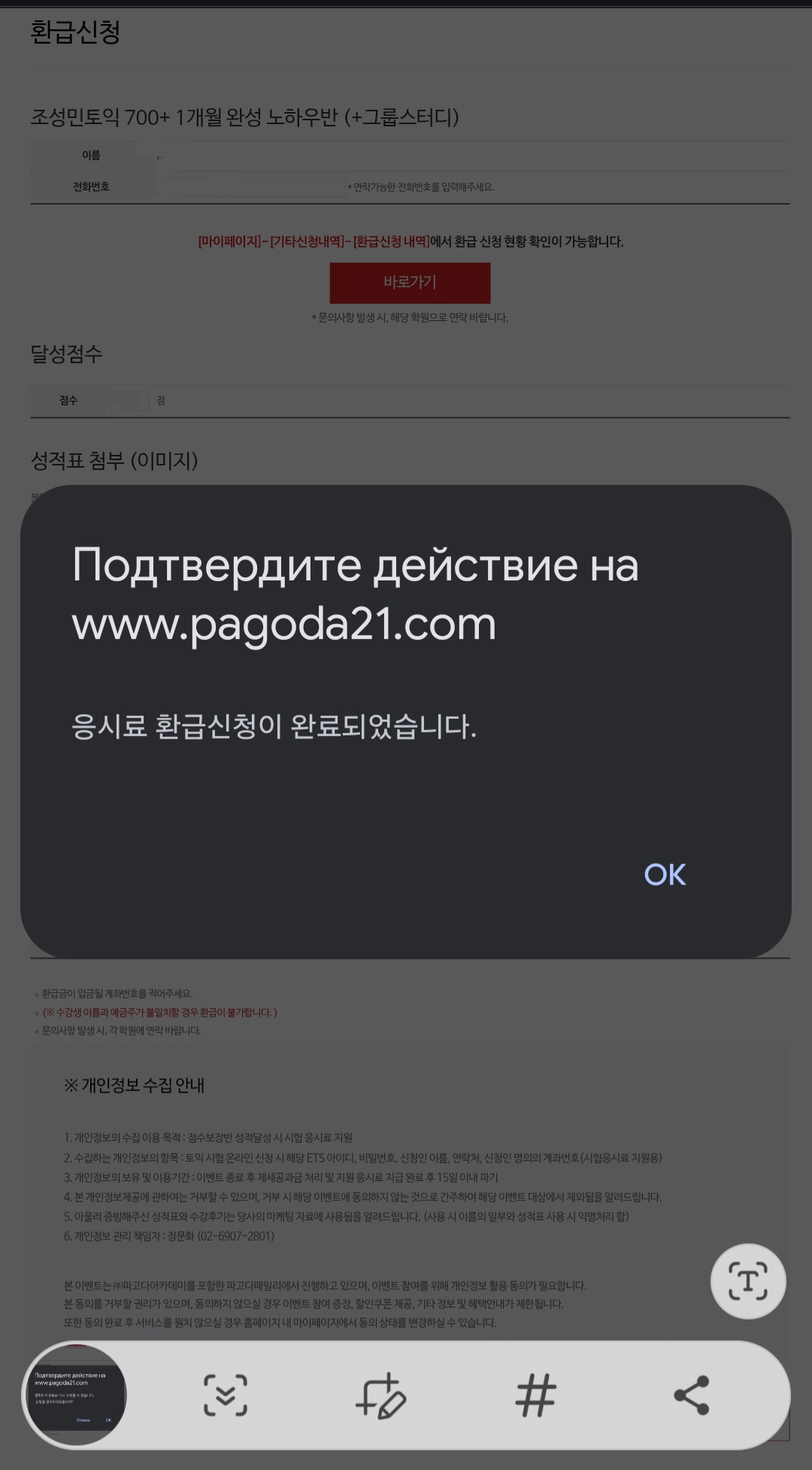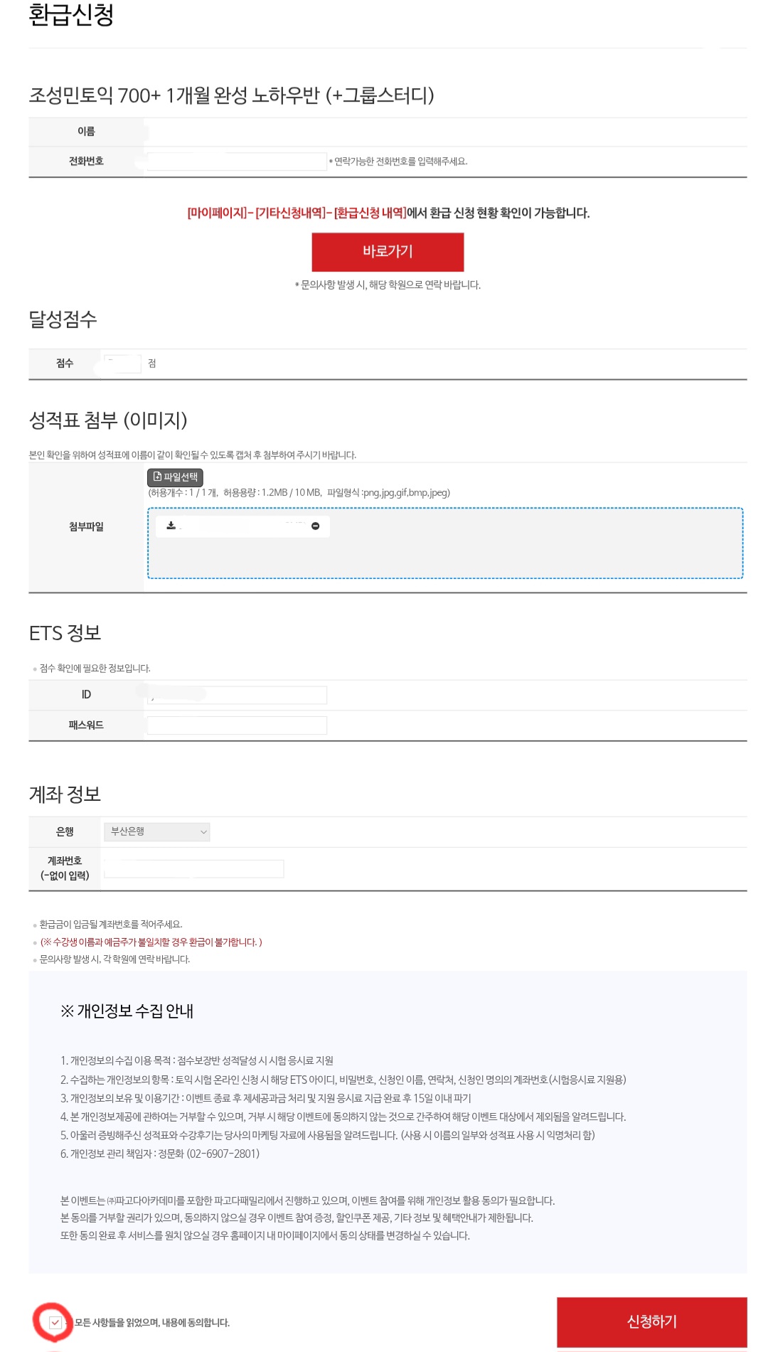 그 다음 이름, 전화번호, 달성점수, 성적표, ETS 계정(토익 사이트 계정), 계좌정보를 입력하고, 개인정보 수집 동의 체크를 한 다음 [신청하기] 버튼을 누르면 됩니다.