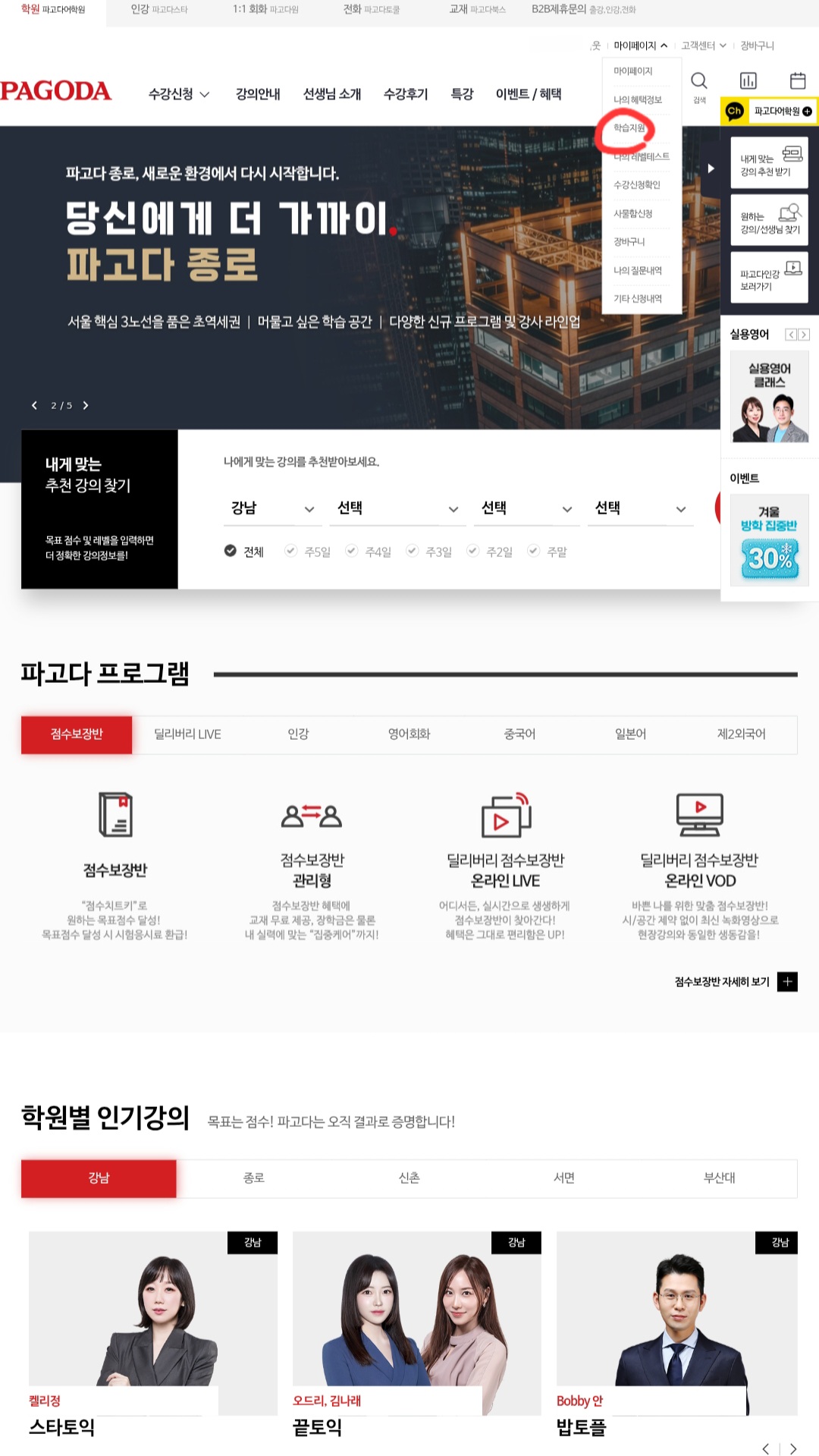 우선 파고다어학원 사이트에 접속해 로그인을 합니다. 그 다음 [마이페이지]-[학습지원]에 들어가 자신이 수강한 강좌를 확인한 뒤 [환급신청]을 클릭합니다.