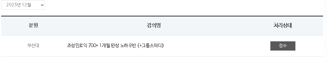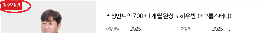 제가 들었던 강좌는 조성민토익 700+ 1개월 완성 노하우반이었습니다. 토익 노베였던 제가 이 수업 듣고 점수가 120점이나 확 올랐어요!! 빡세게 수업을 진행해주시는데, 그 만큼 얻어가는 것도 많고, 더 관리받는다는 느낌도 들었구요. 무엇보다도 점수가 확 확 올라서 추천합니다.