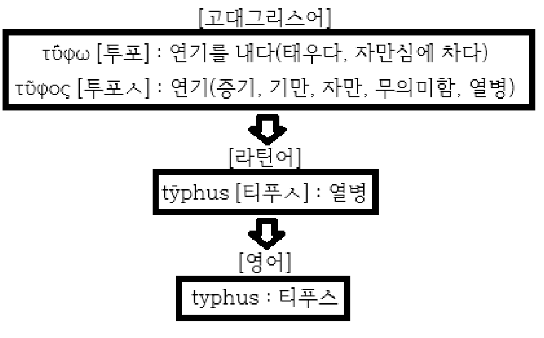 '연기를 내다'라는 뜻의 고대그리스어 동사 τῡ́φω [투포]에서 '연기->허영, 고열'이란 의미로 파생이 되며 '고열을 동반하는 질병'이란 뜻에서 영어 명사 typhus가 등장합니다.