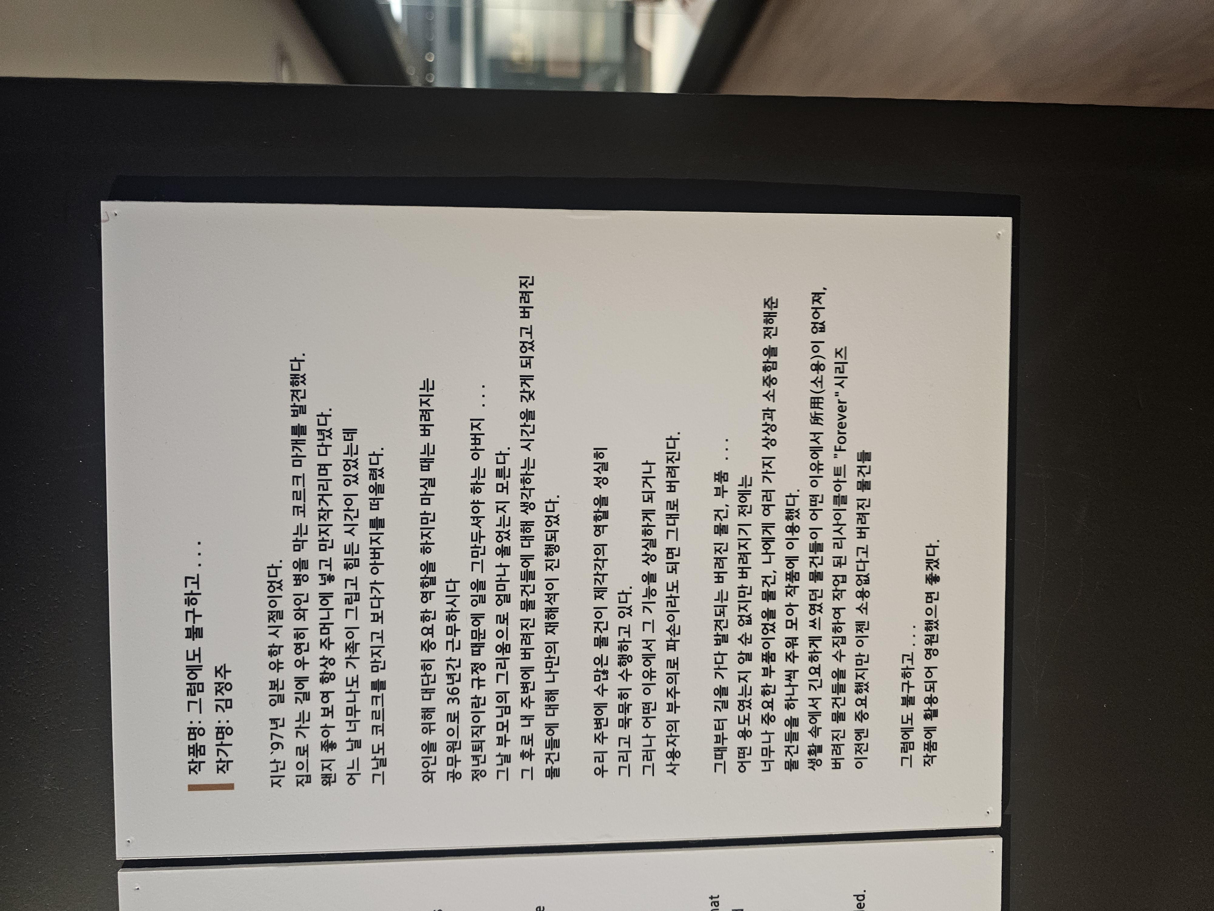 가운데에는 김정주 작가의 <그럼에도 불구하고...>라는 버려진 물건들을 수집하여 작업된 리사이클아트 Forever 시리즈가 전시되고 있어, 지금은 소용없는 것이라도 어떻게든 영원한 가치를 느낄 수 있게 만드는 현대 미술 작품들을 볼 수 있습니다.