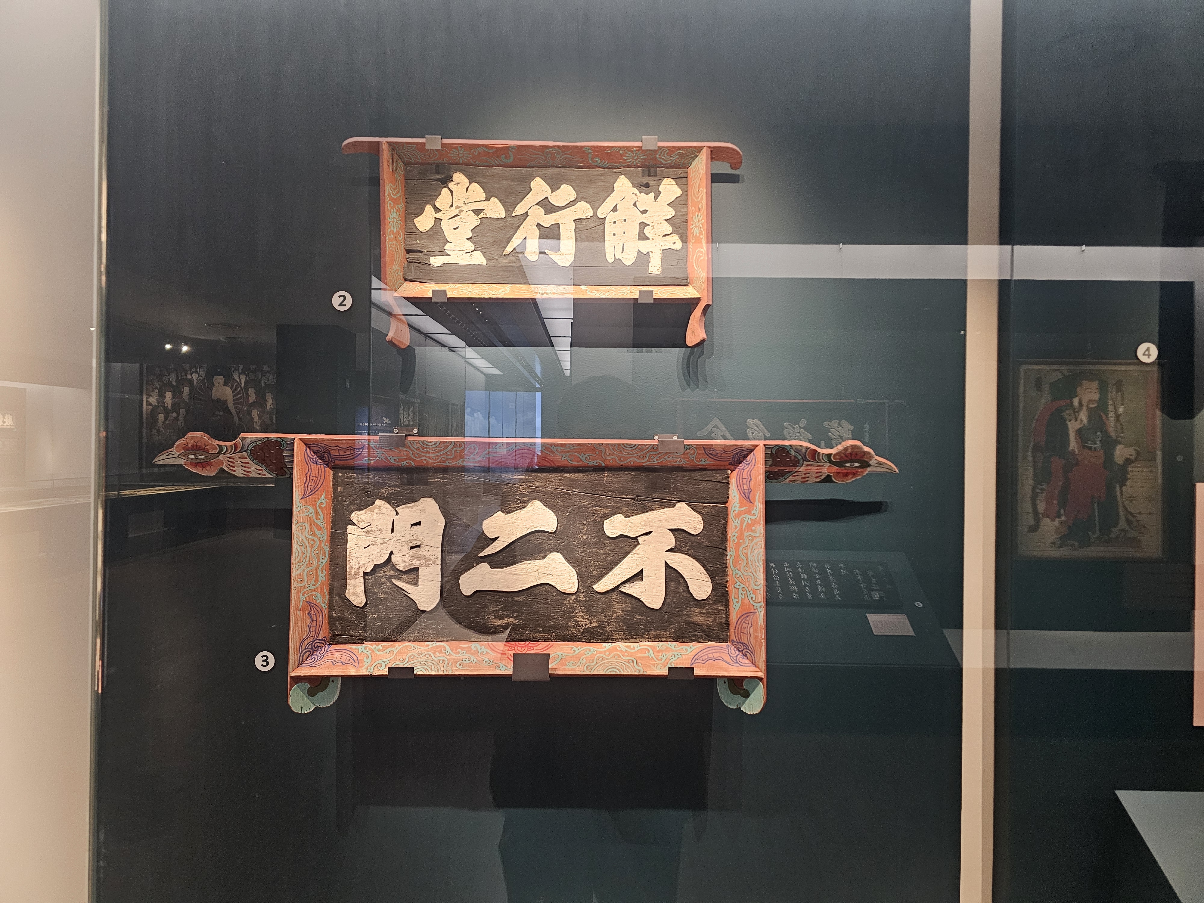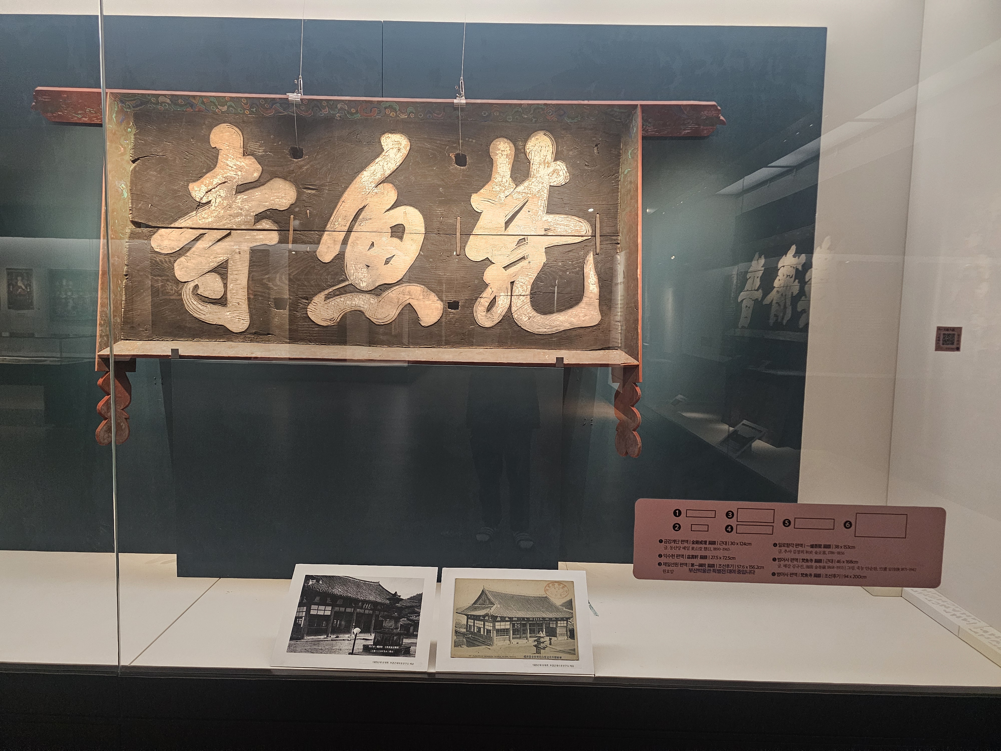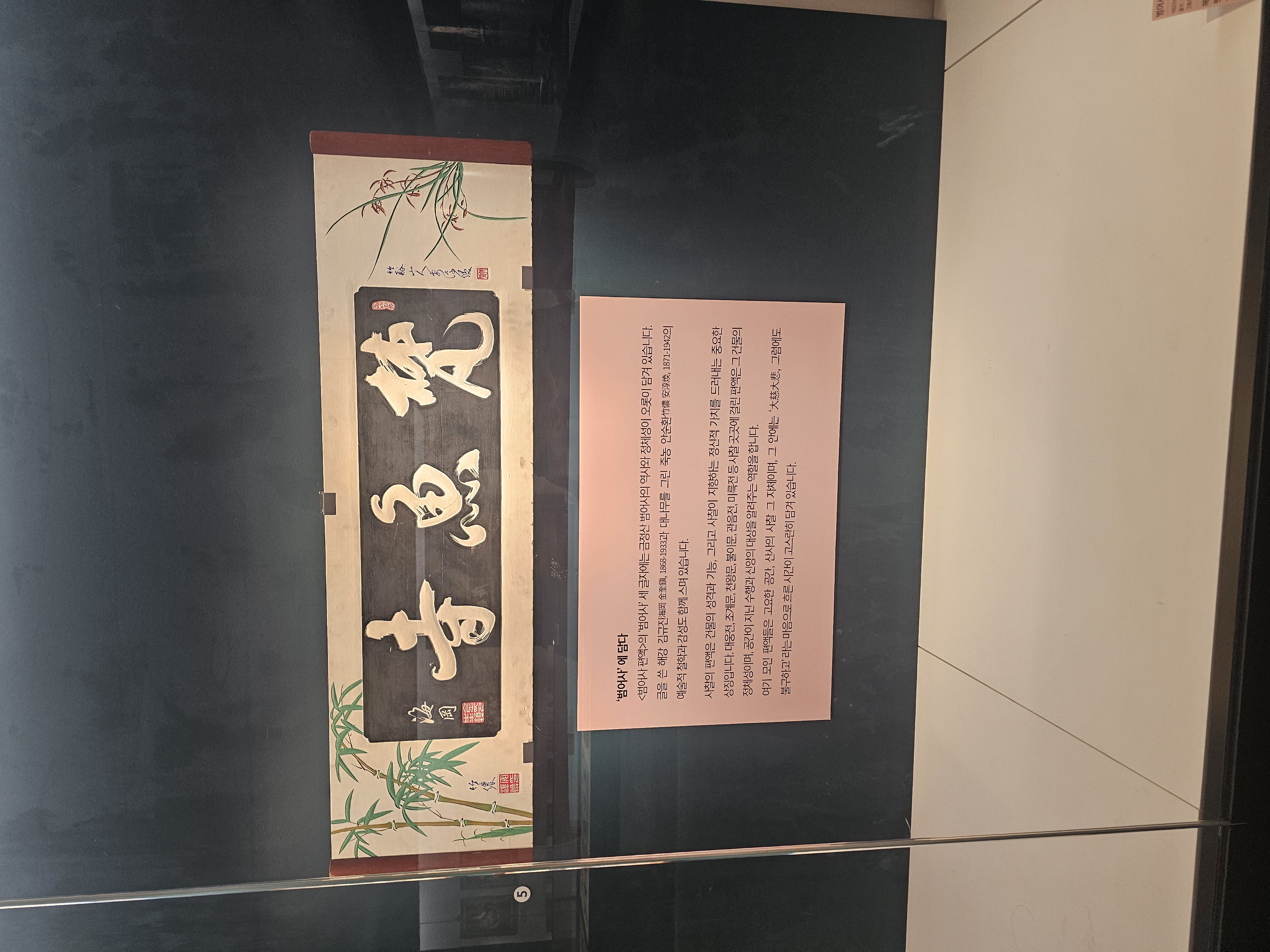 그 옆에는 해강(海岡) 김규진(金奎鎭, 1868-1933)이 쓰고 죽농(竹儂) 안순환(安淳煥, 1871-1942)이 대나무 그림을 그린 <범어사 편액>과 조선 후기에 쓰여진 <범어사 편액>도 볼 수 있구요. <미륵전 편액>, 추사 김정희가 쓴 <부용루 편액>과 <무량수각 편액>도 볼 수 있습니다.