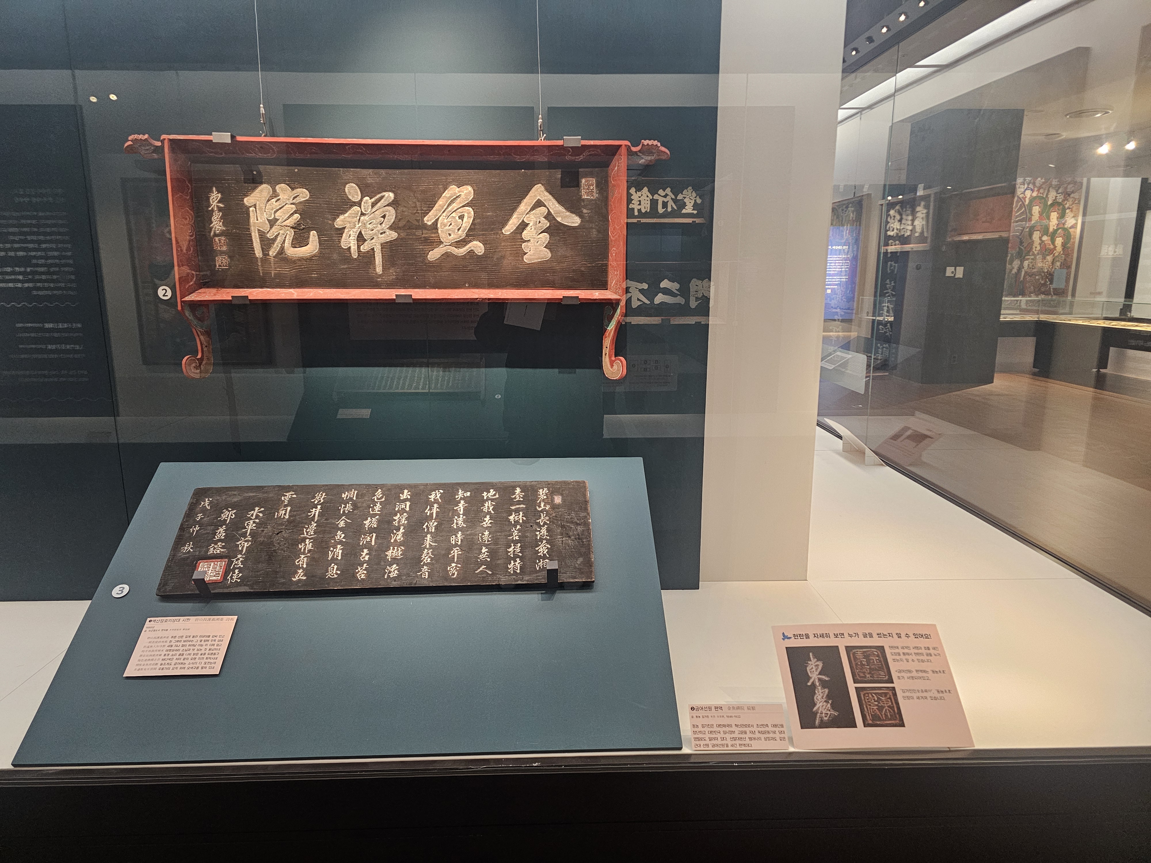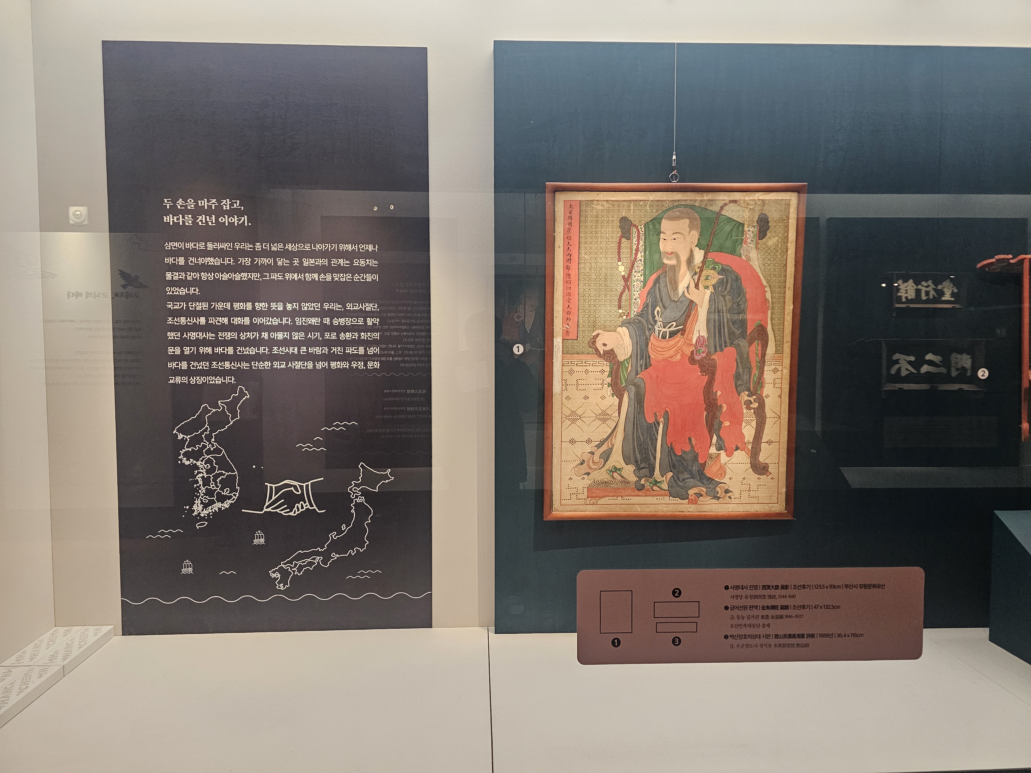 그 다음 임진왜란 떄 승병장으로 왜군을 무찔렀으며 전후 조선인 포로 송환과 새로운 일본 막부와의 화친의 문을 열기 위해 직접 배를 타고 일본으로 다녀온 사명대사를 그린 <사명대사 진영>과 대한제국의 혁신관료로서 조선민족대동단 총재이자 대한민국 임시정부 고문을 지낸 독립운동가 동농 김가진이 쓴 <금어선원 편액>, 수군절도사 정익용이 쓴 <벽산장호의상대 시판>을 볼 수 있습니다.
