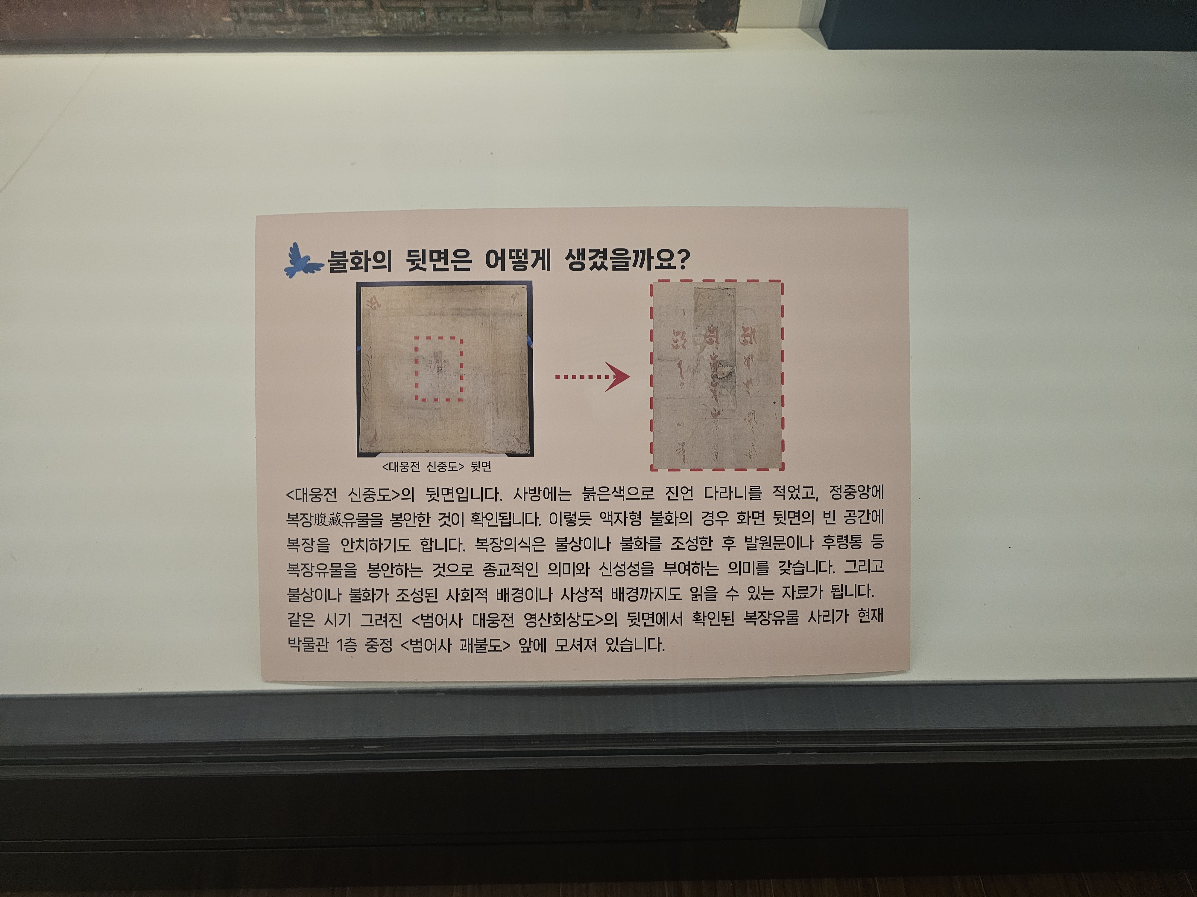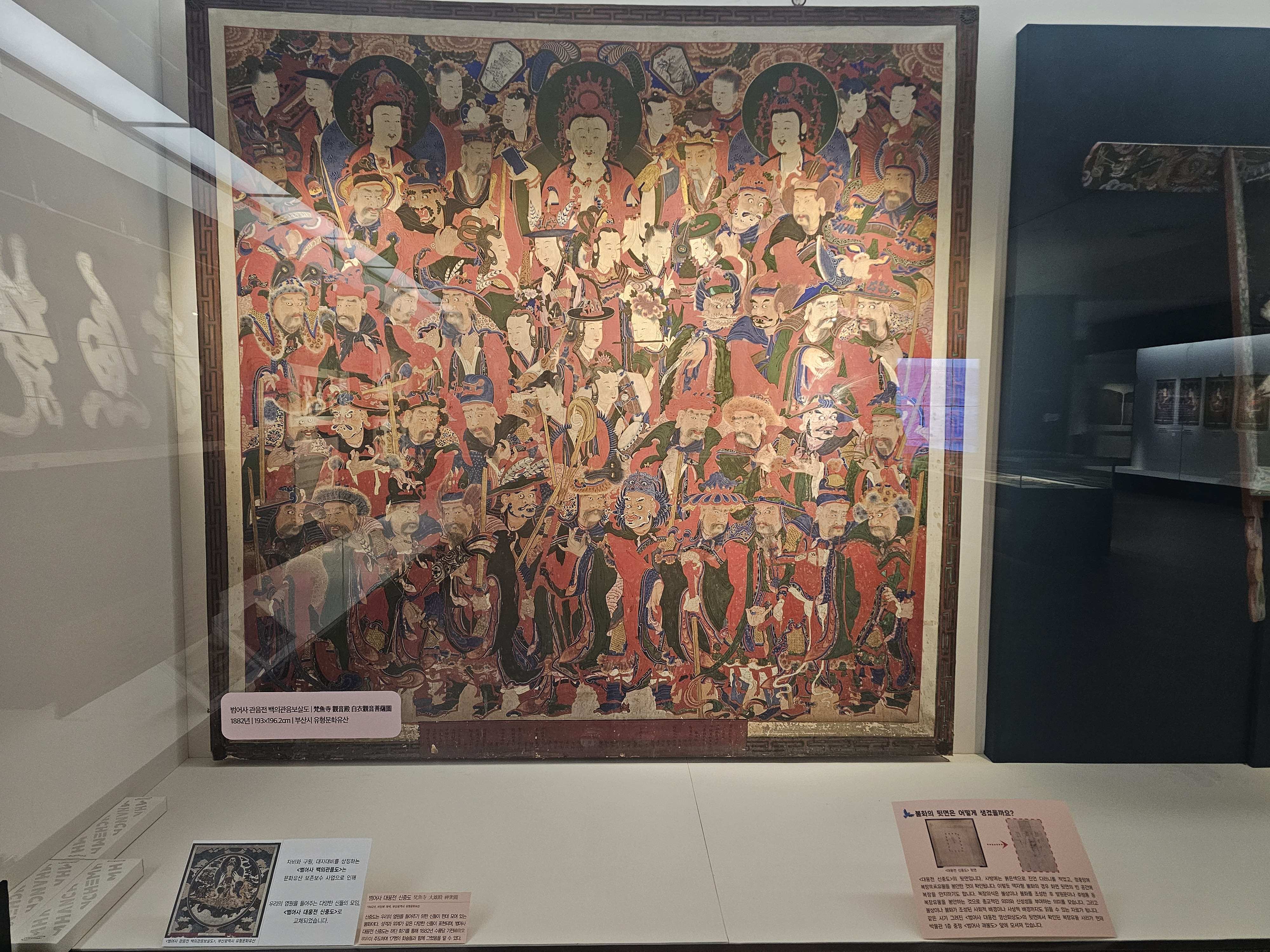1882년에 수룡당(繡龍堂) 기전(琪銓)이 주도하여 17명의 화승들과 함께 비단에 채색하는 방식으로 불자들의 염원을 들어주기 위한 신들을 한데 모여 그린 불화인 <범어사 대웅전 신중도>가 있습니다. 원래 이곳에는 자비와 구원, 대자대비를 상징하는 <범어사 백의관음도>가 전시되어 있었으나 문화유산 보존보수 사업으로 <범어사 대웅전 신중도>로 교체되었다고 하네요.