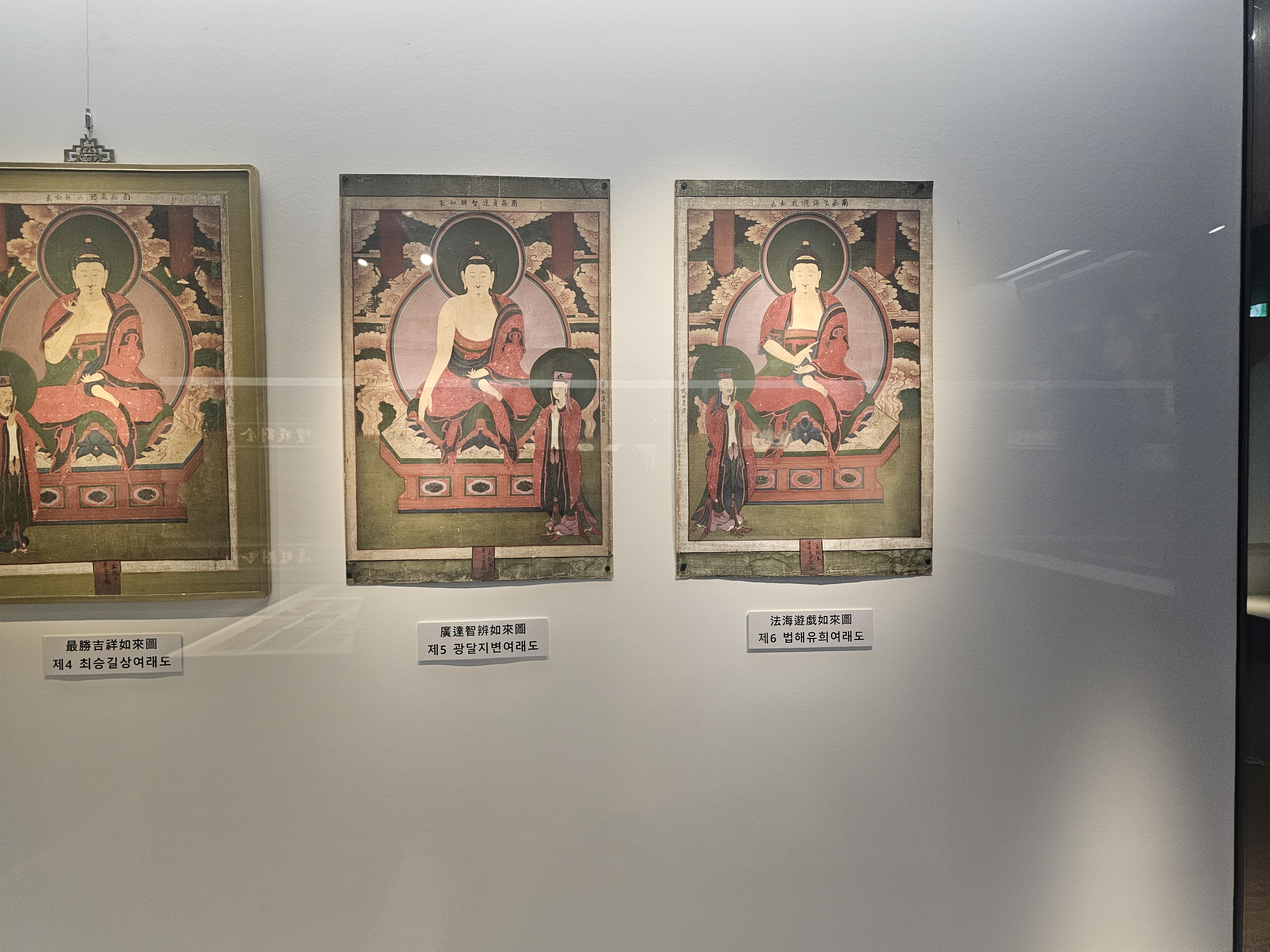 그 양옆으로 조선후기 화승 선종을 중심으로 11폭으로 구성되어 밀양 표충사에서 제작되어 범어사 극락암으로 옮겨 봉안된 <범어사 극락암 칠성도>의 일부분이 전시되어 있습니다. 미지의 경로로 방출되어 2015년 7월에 스위스에서 경매로 발견된 3폭의 그림을 범어사와 국외소재문화재재단(2012-2024, (현)국외소재문화유산재단)이 사들여 돌아왔죠.