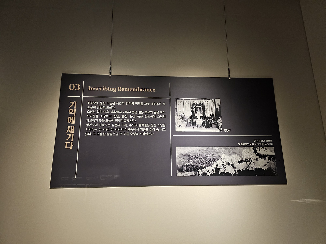 전시실 처음에 들어서면 동산 대선사가 쓴 '감인대(堪忍待)'라는 글귀가 맞이해줍니다. 그의 인생을 담을 수 있는 글귀를 통해 동산 대선사가 누구인지 어떤 분일지 궁금증을 가지게 되죠.