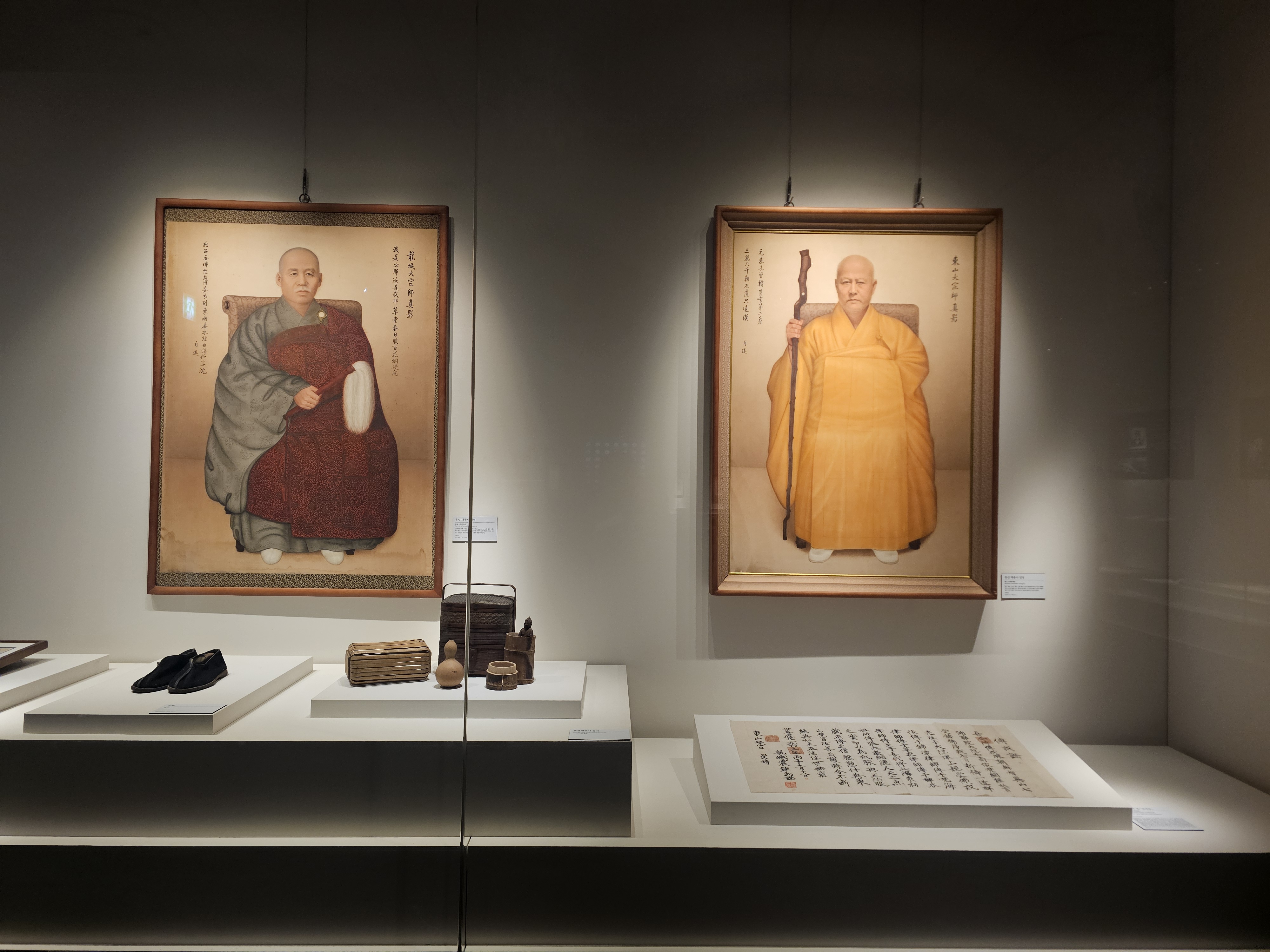 왼편에는 1982년에 그려진 근현대 한국불교의 큰스승이면서 참선 수행과 계율을 중시하며 생활불교를 실천한 선각자이자, 일제강점기에는 한용운과 함께 민족대표 33인 중 2인의 승려 중 한 분으로 3.1운동에 참여한 용성 대종사(1864-1940)의 진영이 걸려 있습니다. 그 오른쪽에는 1982년에 그려진 용성 대종사의 제자이자 특별기념전시의 주인공이면서 불교 종단 지도자로서 큰 축이었던 동산 대종사의 진영이 있습니다.