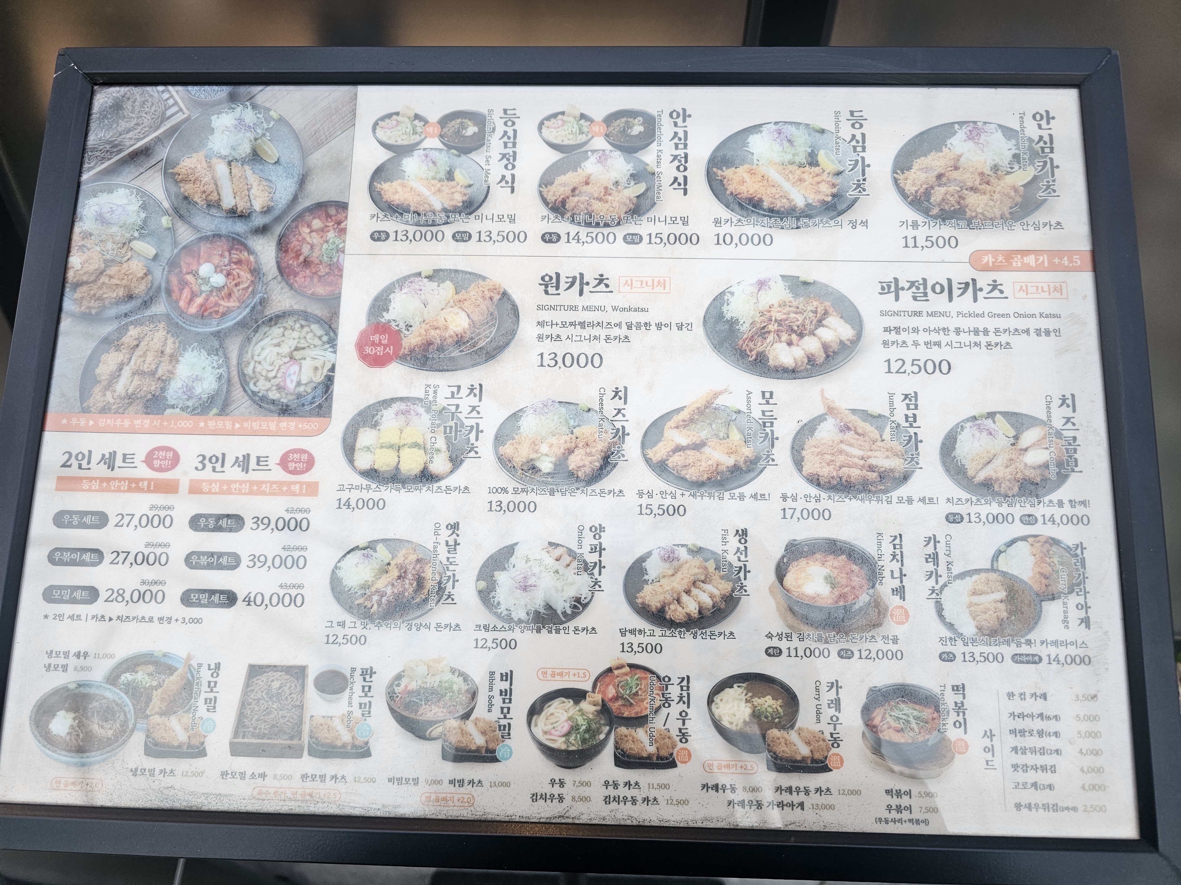 | 12500원 | 파절이카츠, 옛날돈카츠, 양파카츠, 냉모밀카츠, 판모밀카츠, 김치우동카츠 |