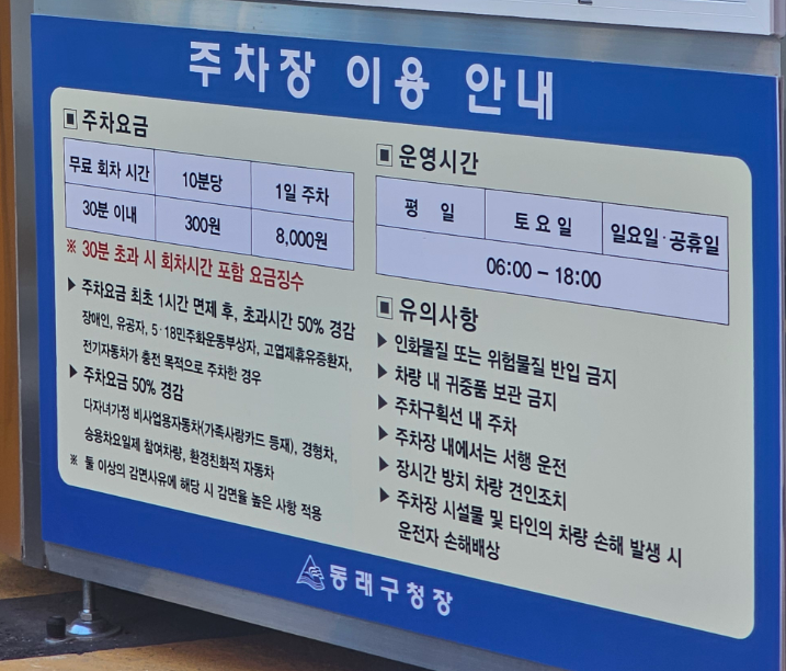 또 다자녀가정 비사업용자동차(가족사랑카드 등재), 경형차, 승용차요일제 참여차량, 환경친화적 자동차의 경우 주차요금 50% 경감이라고 하네요. 만약 둘 이상의 감면사유에 해당하면 감면율이 높은 사항을 적용한다고 합니다. 동래구청에 차를 타고 볼일을 보러 오시는 분들은 한 번쯤 보시고 주차장 이용 계획도 세워보세요~