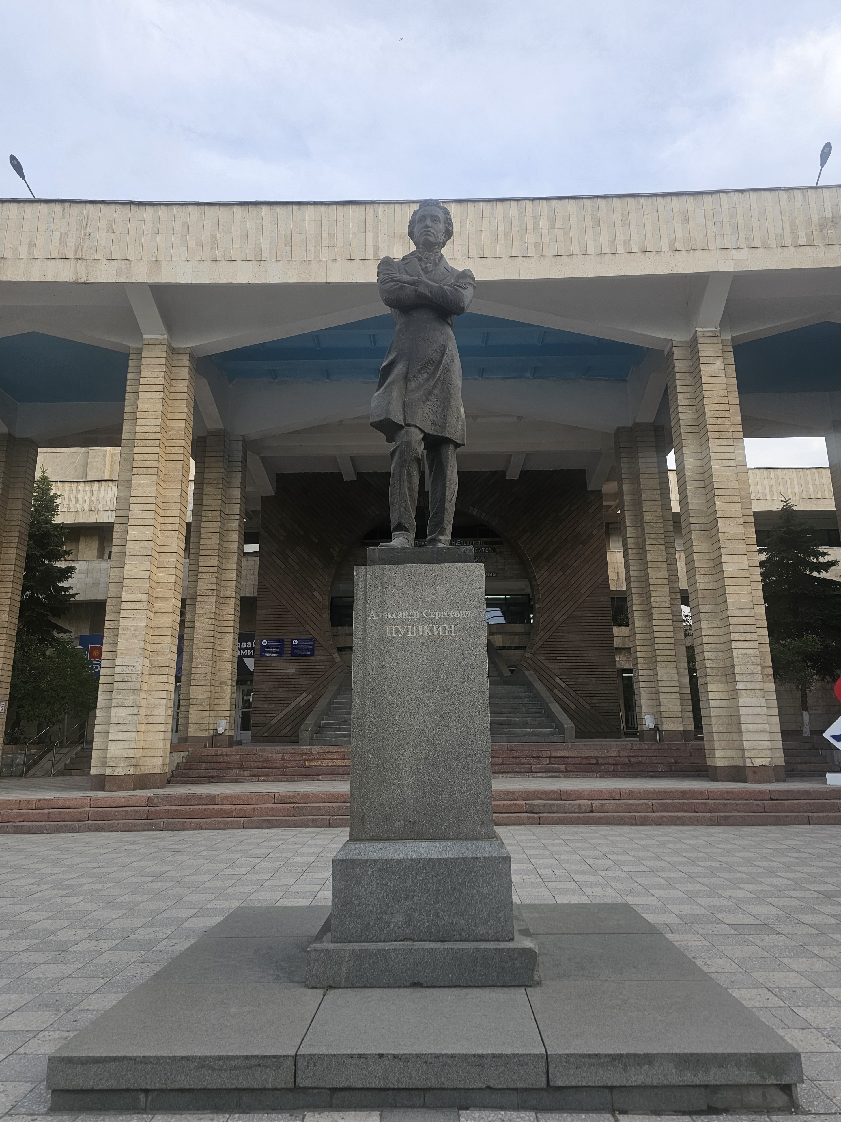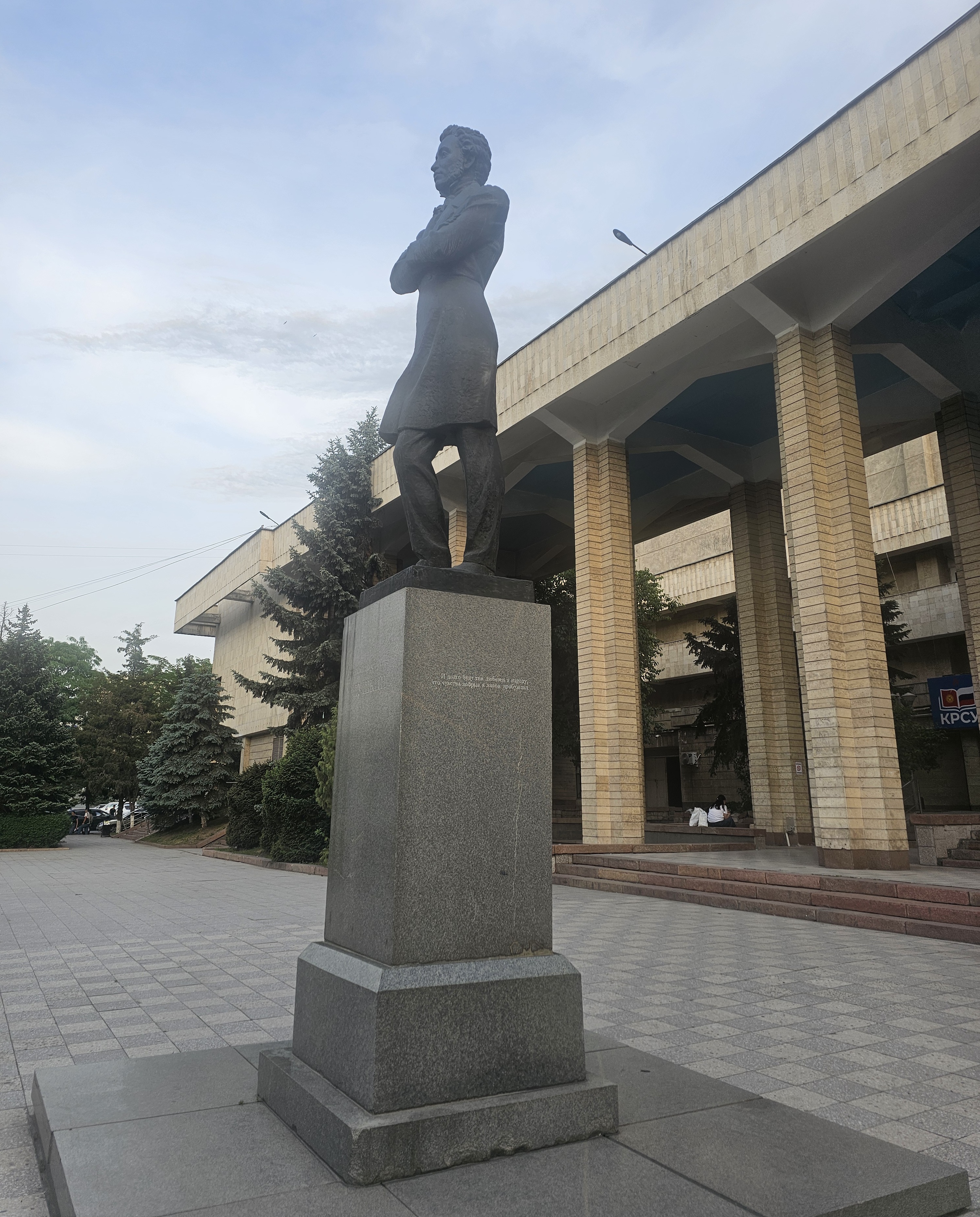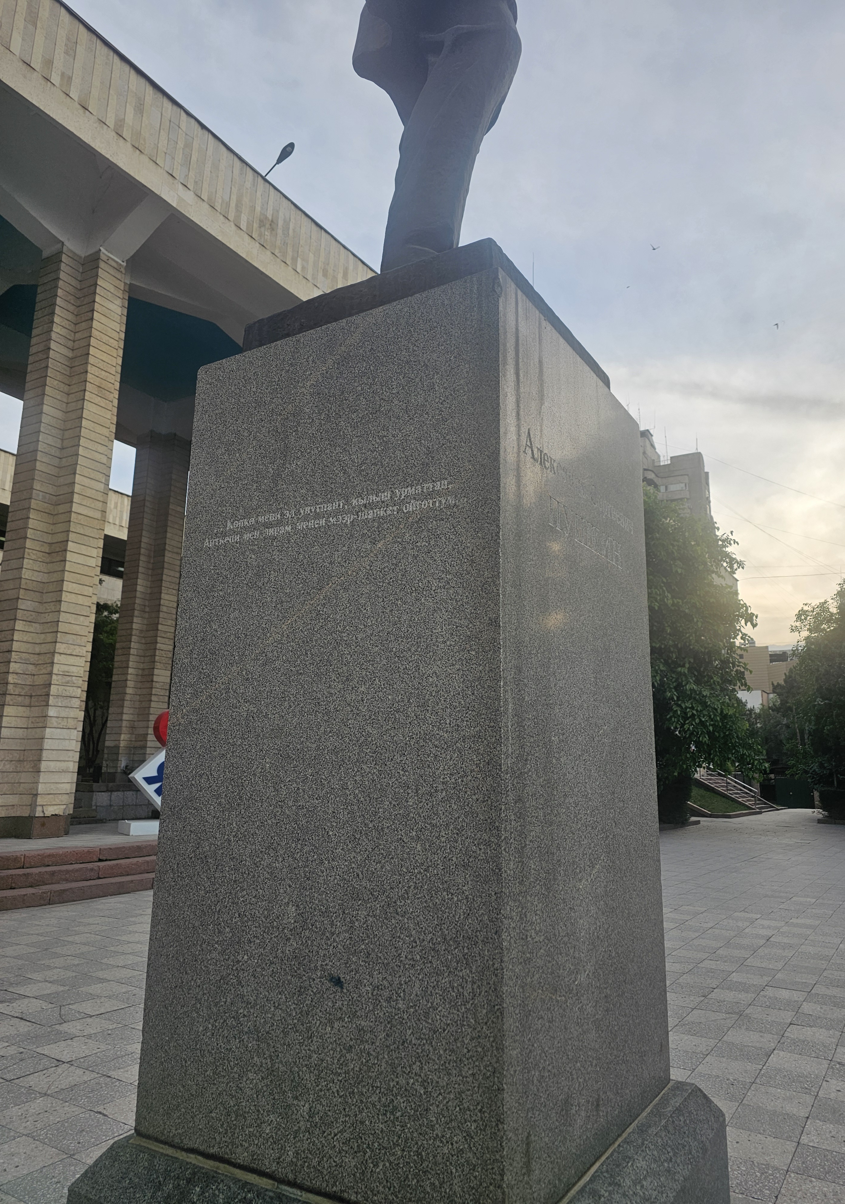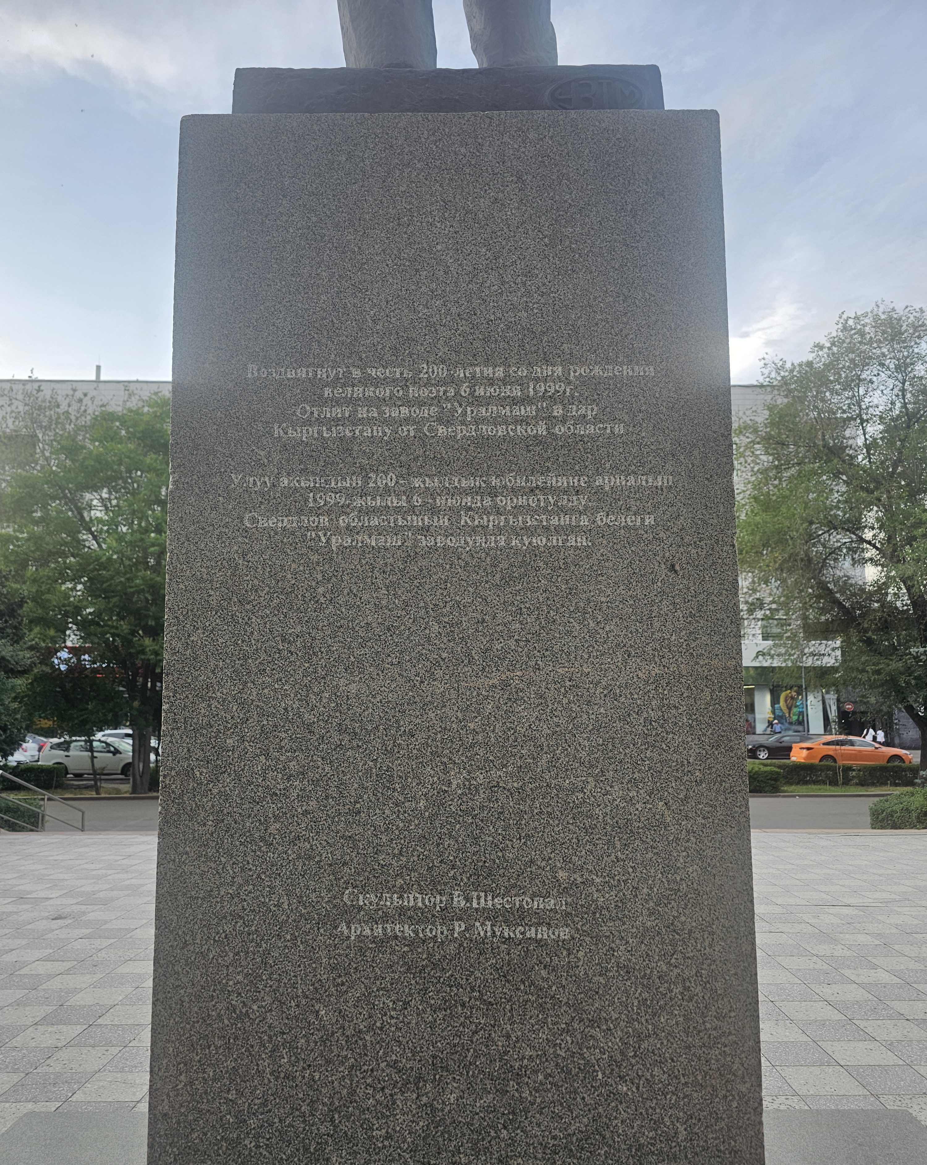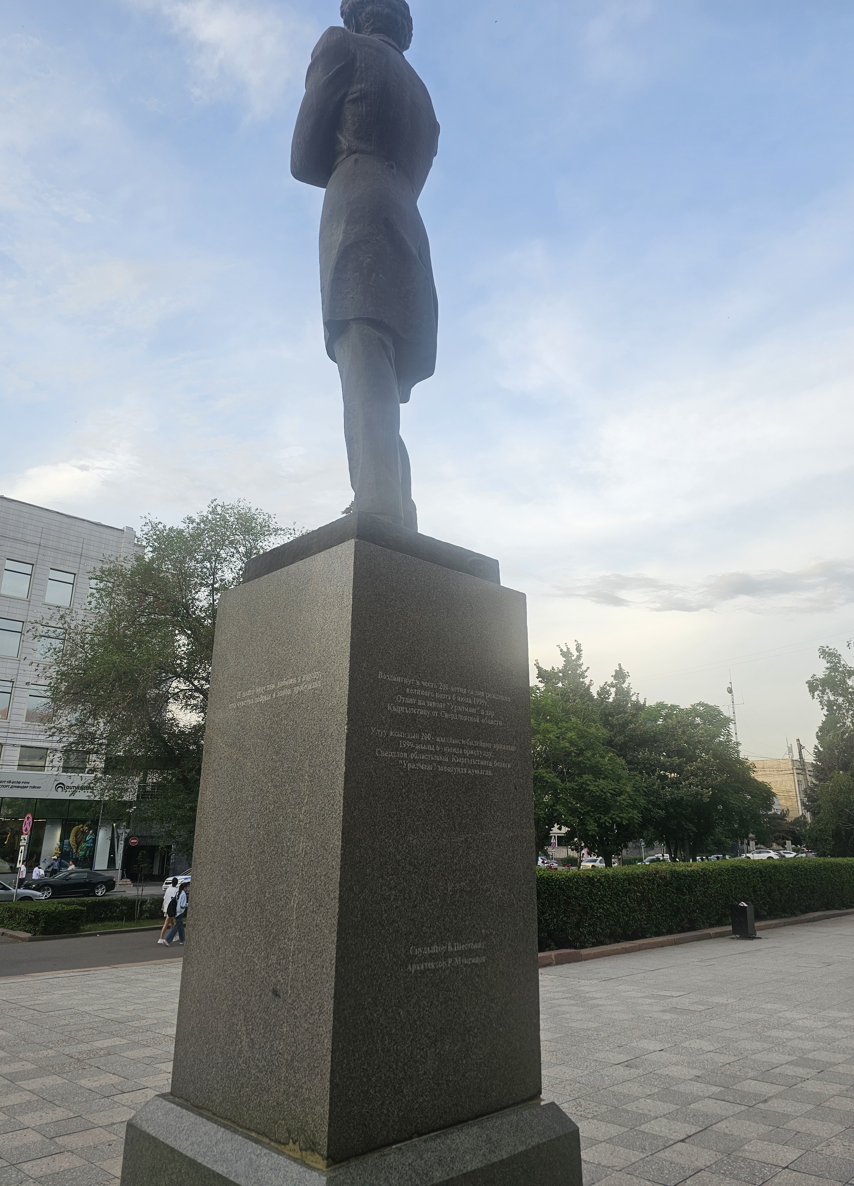 뒤에는 '위대한 시인의 탄생 200주년을 기념하여 1999년 6월 6일에 건립됨.(Воздвигнут в честь 200-летия со дня рождения великого поэта 6 июня 1999 г.).', '스베르들롭스크주가 키르기스스탄에 주는 선물로 '우랄마쉬' 공장에서 주조됨.(Отлит на заводе «Уралмаш» в дар Кыргызстану от Свердловской области)'이라는 건립 근거가 쓰여져 있습니다. 러시아와 키르기스스탄의 우호를 잘 볼 수 있는 문구네요.