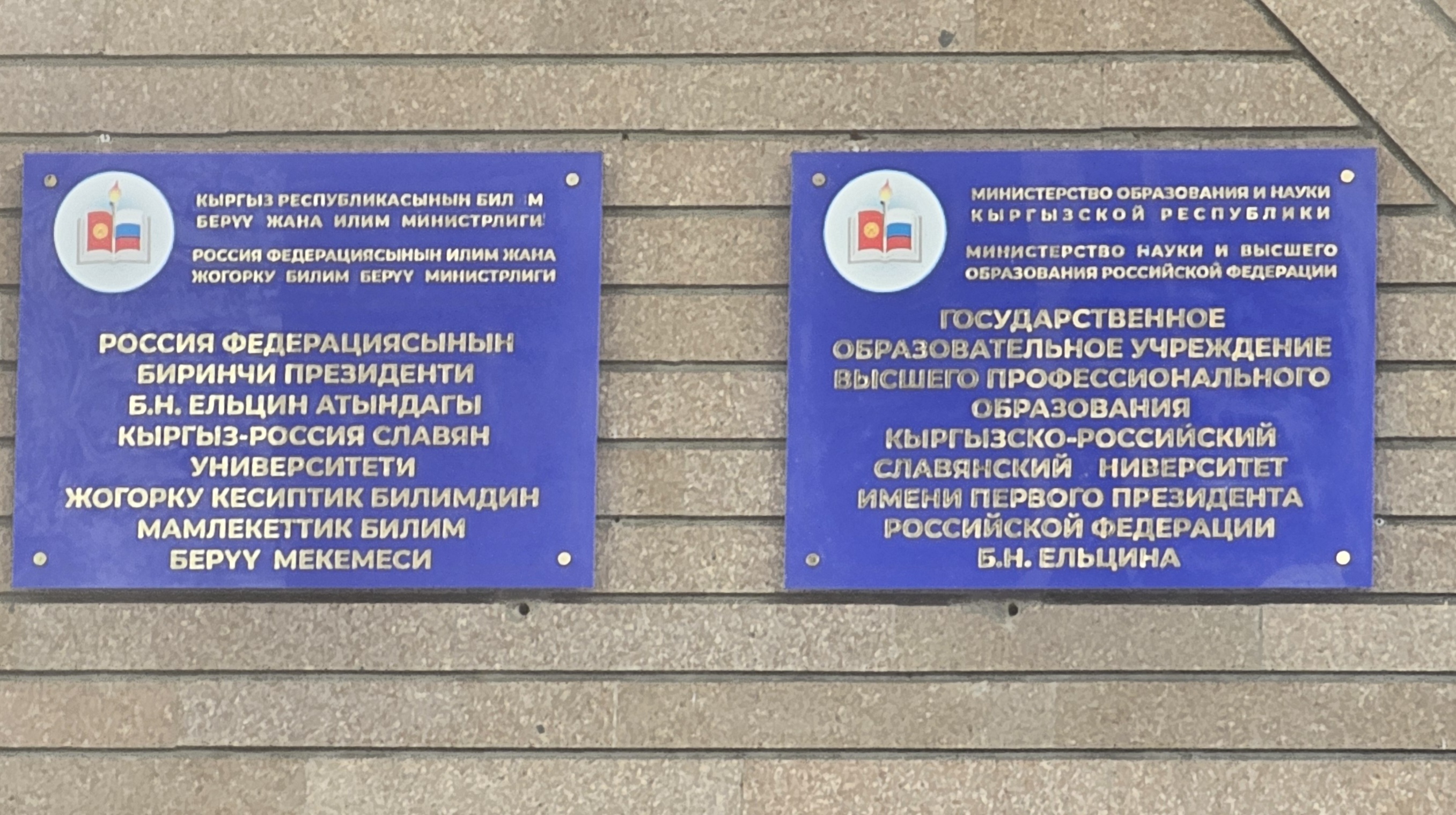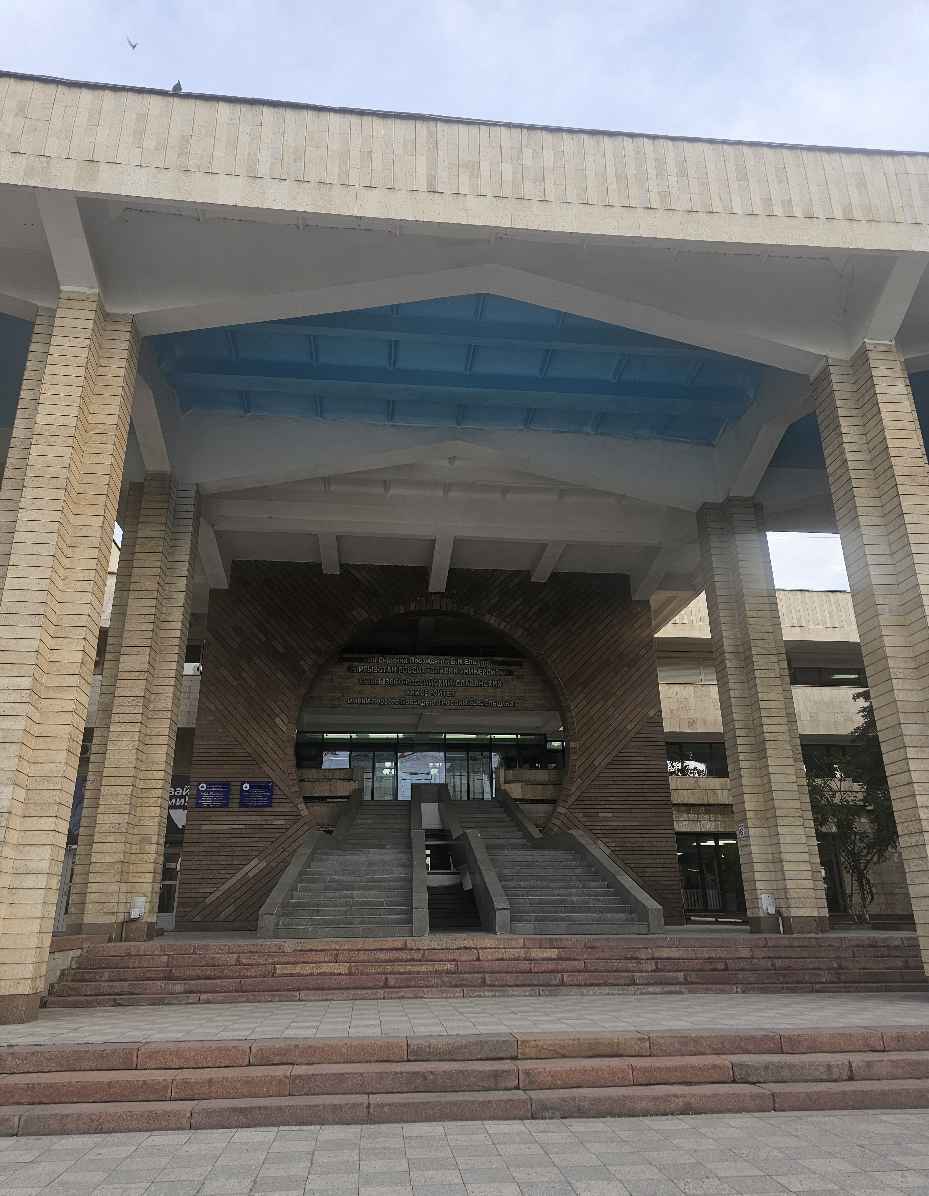 키르기스스탄 비슈케크 스베르들로프구에 위치한 키르기스러시아슬라브대학교(Кыргызско-российский славянский университет, 1992-2004)의 뒤를 이은 보리스니콜라예비치옐친키르기스러시아슬라브대학교(КРСУ, Кыргызско-Российский Славянский университет им. Б.Н. Ельцина, 2004)의 본관 정문입니다.