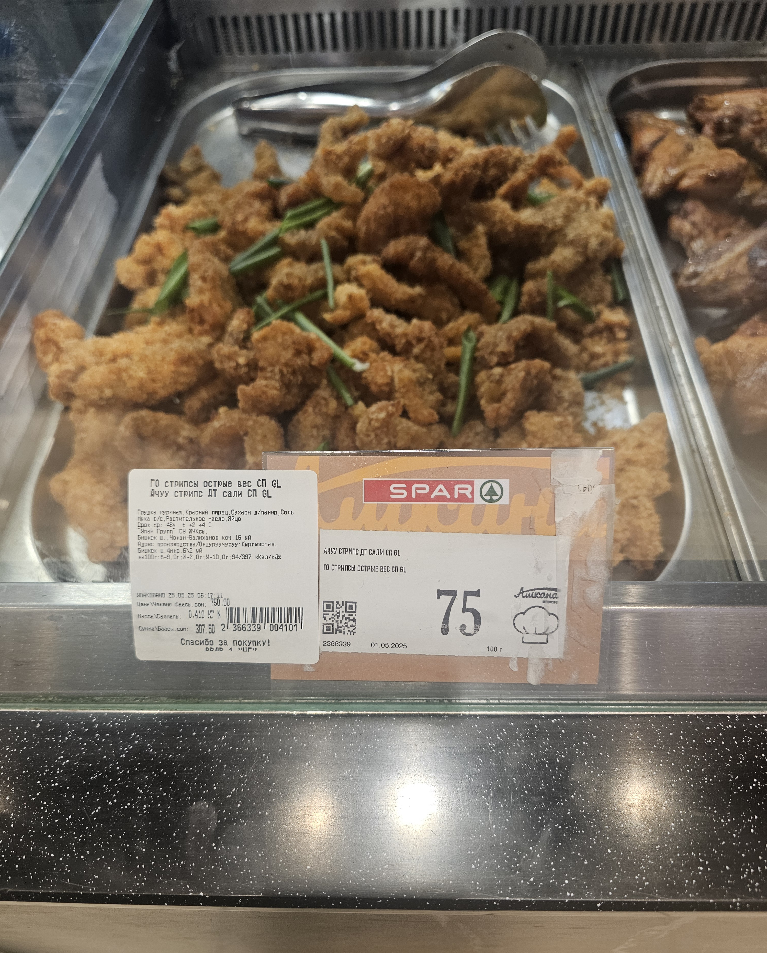 키르기스스탄 비슈케크의 24시간 여는 마켓 SPAR에서 파는 완제품(ГО, готовая продукция) 핫텐더(стрипсы острые)입니다. 100g당 75솜입니다.