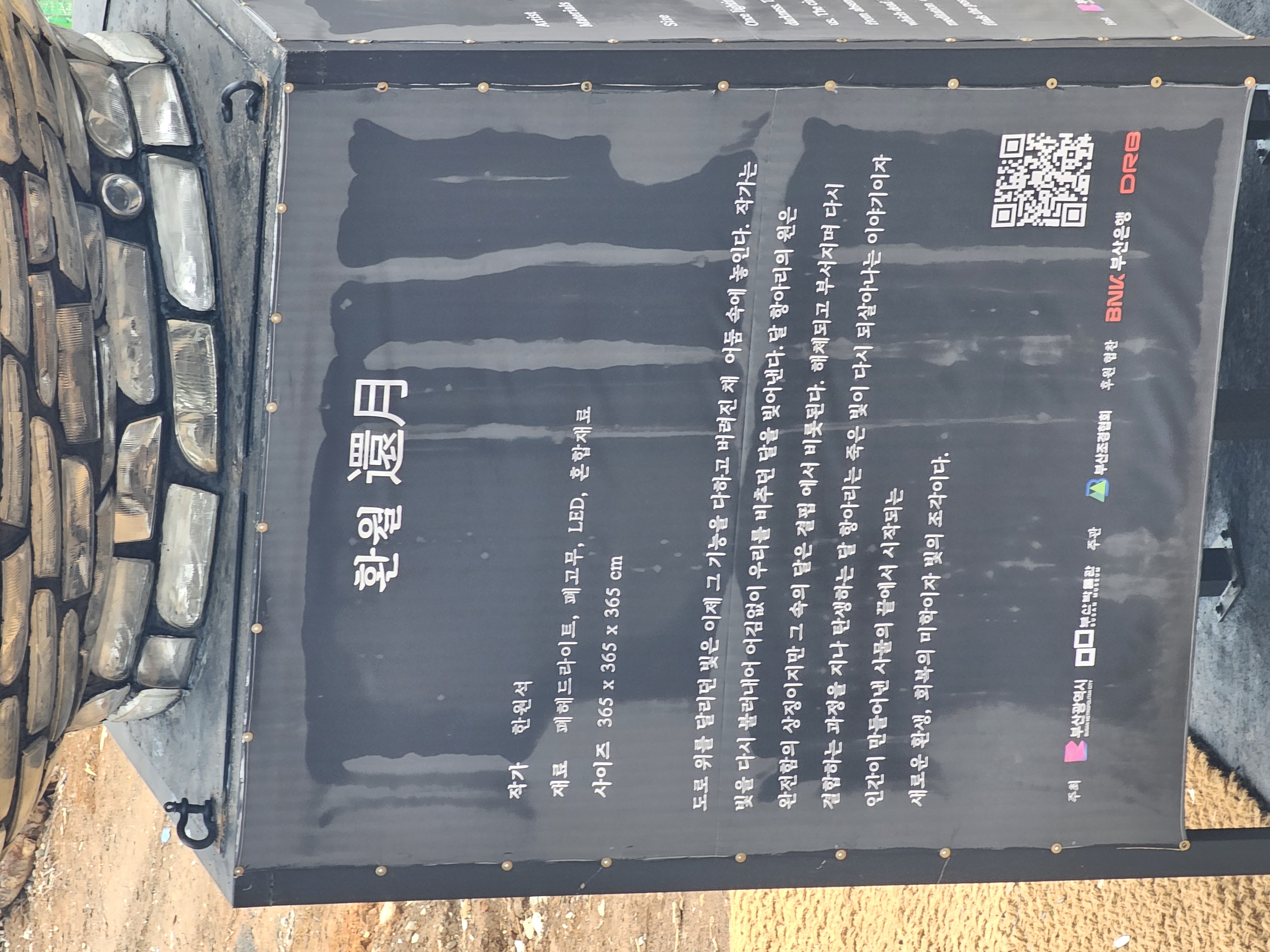 밤이 되면 달빛이 달항아리를 비쳐 빛나듯 LED를 설치한 재활용 타이어와 헤드라이트가 반짝 빛나며 거대한 달항아리 모습이 빛납니다. 제48차 세계유산위원회가 부산에서 개최되는 것을 기념하는 특별전 <조선왕실과 세계유산>이 열릴 동안에도 부산박물관 야외정원에서 전시됩니다.