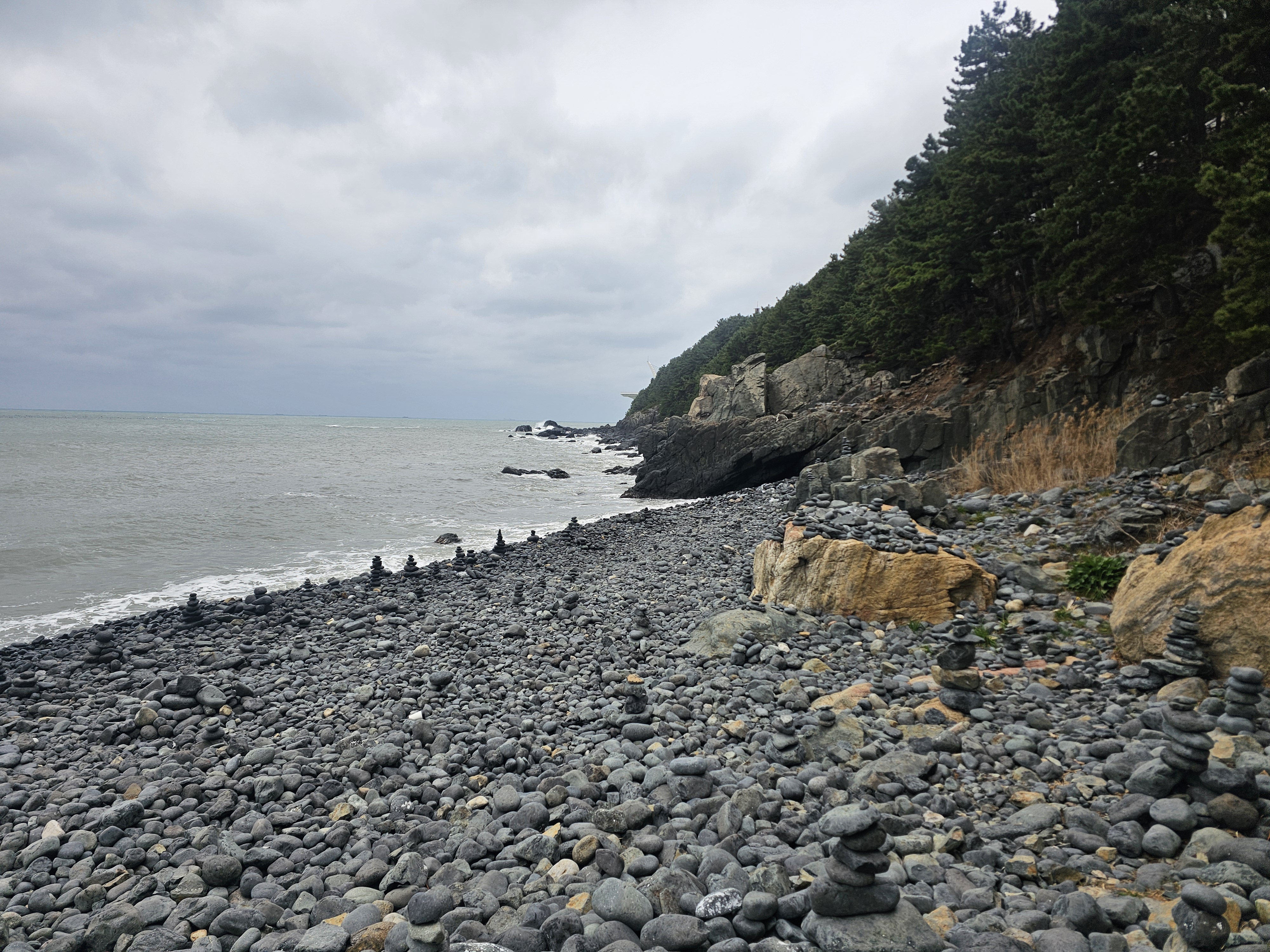 몽글몽글 몽돌들이 있는데, 이미 다녀간 사람들이 돌탑도 쌓아둬서 귀여웠어요. 이곳에서 가만히 있으면서 바다 소리를 들으니 마음에 편해지더라구요~