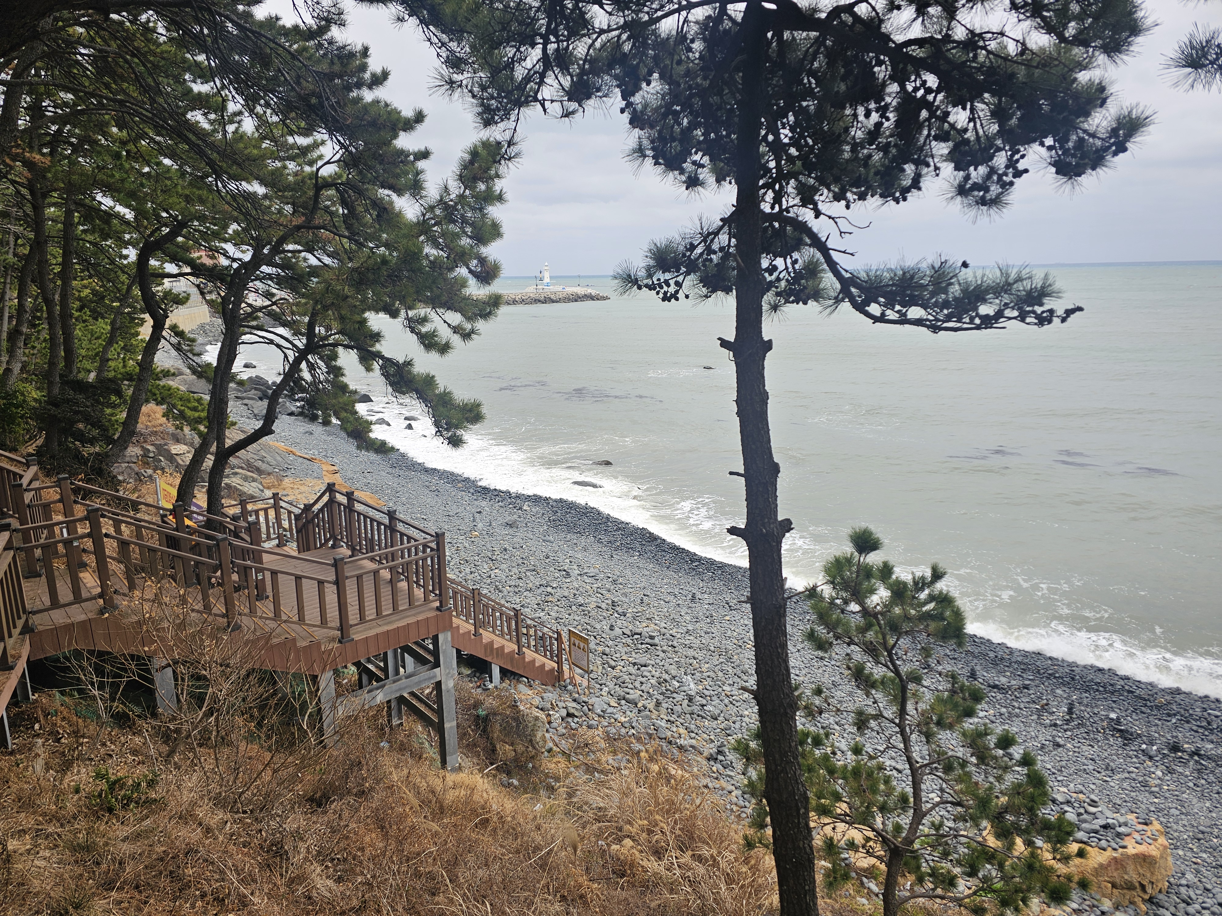 해운대 해변열차 청사포정거장에서 미포 방향인 남쪽으로 약 6분 걸어오면 보이는 풍경입니다. 저곳이 바로 청사포 몽돌해변이죠. 오전 9시부터 18시까지 출입이 가능한데, 야간이나 악천후에는 출입 금지입니다.
