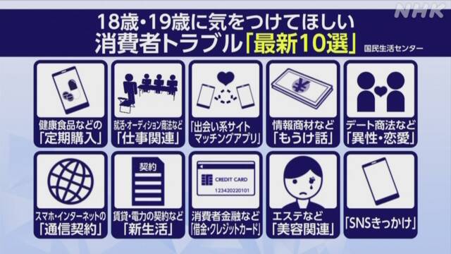 국민생활센터가 공표한 새롭게 성인이 되는 (만)18세와 (만)19세에게 특히 조심하길 바라는 소비자 트러블(trouble) '최신 10선'에서는, 구체적인 상담 사례와 막기 위한 포인트(point)를 자세히 소개한다.