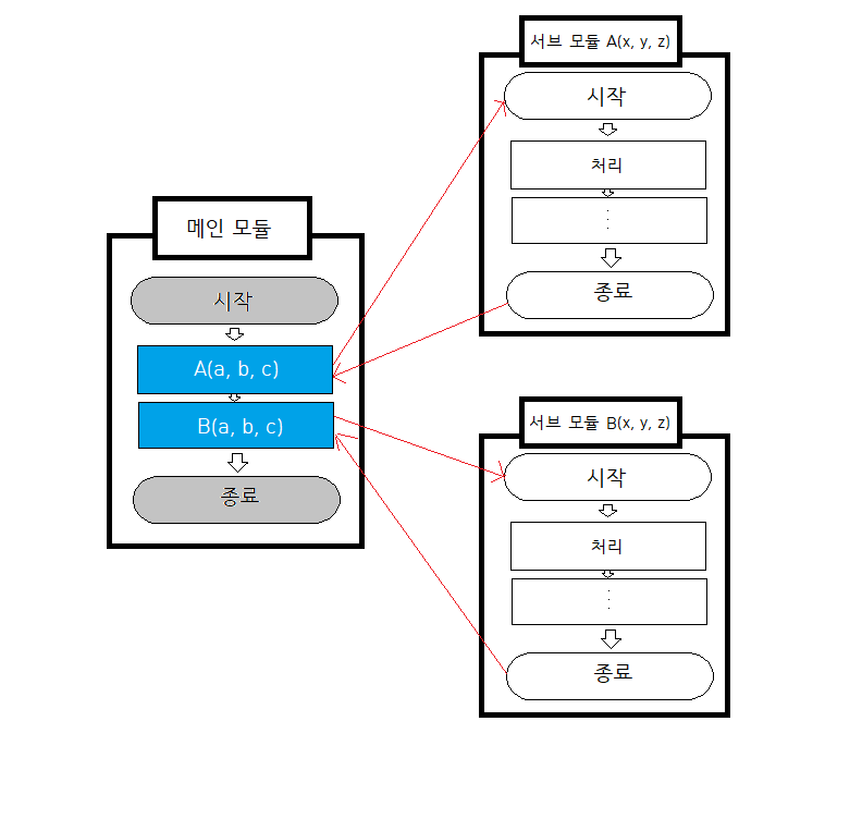 한편, 메인 모듈과 서브 모듈은 매개변수를 이용해 데이터를 주고받을 수도 있다.