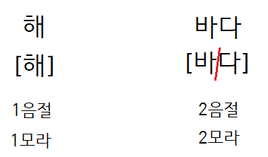 한편, 이 [해]라는 발음은 1박자 단위가 되고, [바다]라는 발음은 2박자 단위가 되어 각각 1모라, 2모라가 된다.