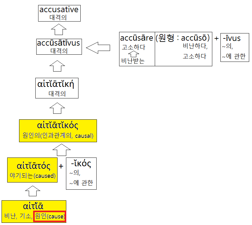그 형용사의 유래가 된 여성명사 αἰτῐ́ᾱ[아이티아]는 '원인, 동기'라는 뜻도 있지만, '기소, 비난'이라는 뜻도 가지고 있었는데, 이를 라틴어로 번역하면서 '기소, 비난'이라는 부분에만 집중해 'accusation(기소, 비난)'이라는 말뜻으로 번역해버려 이런 오류가 일어났다... 만약 원래 의미를 살려 제대로 번역했다면 αἰτῐᾱτῐκή[아이티아티케]를 causātīvus[카우사티부스]라고 번역했을 것이고 이는 지금 '원인이 되는, 사역의'라는 뜻으로 쓰이는 causative로 영역되었을 것이다.