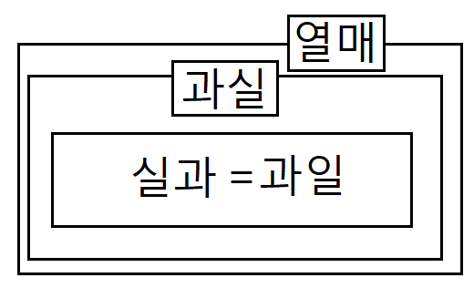통상적으로 과실=열매+과일(실과)라고 보면 되는데, 이 과일(실과)라는 것도 열매이기 때문에 과실=열매라고 볼 수도 있다. 이렇게 되면 아래와 같은 포함관계가 나올 수도 있다.