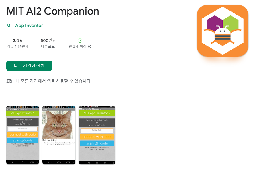 방법은 위와 같다. 앱 인벤터2 aiStarter 다운로드 사이트(https://appinventor.mit.edu/explore/ai2/setup-emulator.html)에 접속해 프로그램을 다운받고 USB와 MIT AI2 Companion를 다운받은 핸드폰을 연결한 뒤 다운받은 프로그램을 실행하면 된다. 그러면 모바일 기기에 깔린 어플을 통해 자신이 만든 앱을 테스트할 수 있다.