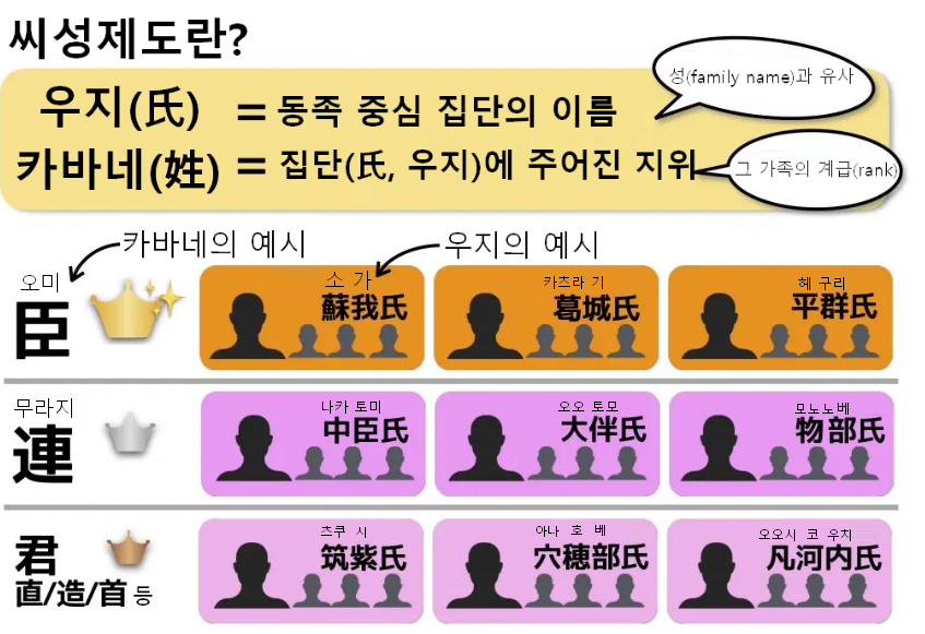 | 1. 오미(臣)였던 소가씨(蘇我氏)와 무라지(連)였던 모노노베씨(物部氏)가 축이 된 연합 체제 2. 불교 수용 문제로 소가씨(蘇我氏) vs 모노노베씨(物部氏)의 대립 구도 형성 |