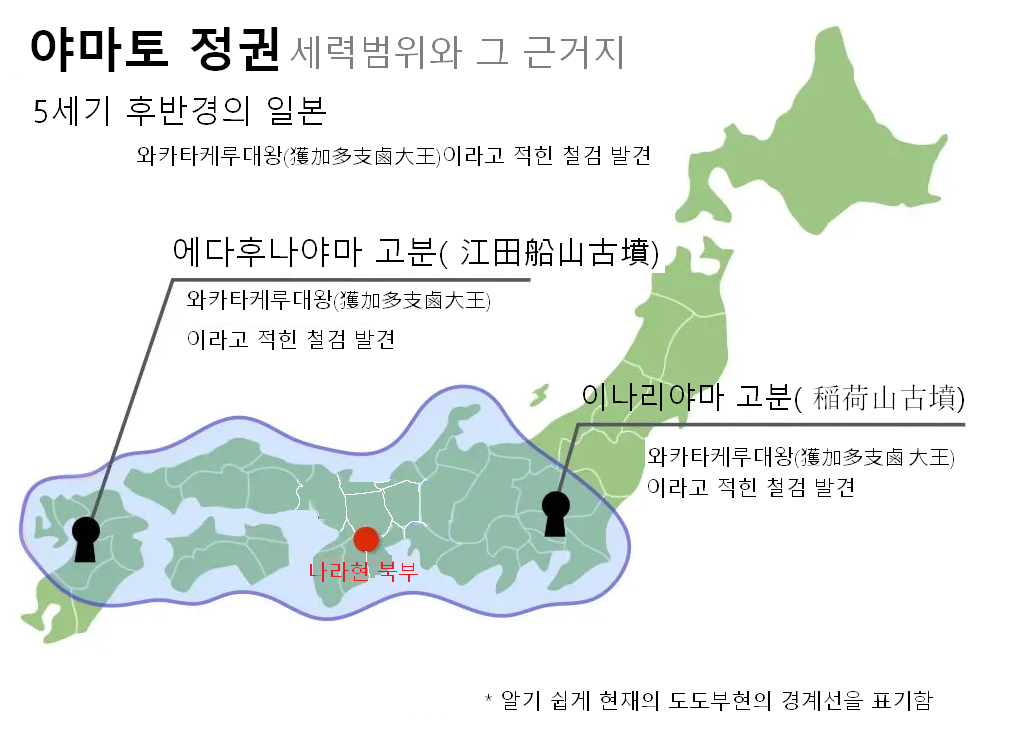 이 야마토 왕권의 범위에 대해서는 많은 이견이 있지만 대체적으로, 2세기 말에서 3세기에 걸쳐 오사카 평야부터 야마토 분지에 있었던 세력, 키비노쿠니(吉備国)를 비롯한 세토우치 지방(瀬戸内地方)나 시코쿠(四国), 산인 지방(山陰地方), 키타큐슈(北九州)를 포함한 서일본(西日本), 도카이 지방(東海地方) 등 지역을 초월한 세력이 연합해 야마토 분지 동남부의 현재의 마키무쿠 유적(纒向遺跡)이 있던 땅에 성립해 3세기 후반~5세기까지는 토우호쿠 지방(東北地方)의 남쪽에서 미나미큐슈(南九州)까지 일본 열도에서의 넓은 범위에 영향을 미치게 된 것으로 보는데 이 범위가 전방후원분이 분포한 지역과 비슷해 전방후원분 체제(前方後円墳体制)라고도 불린다. 특히 규슈의 에다후나야마 고분과 간토 지방의 이나리야마 고분에서 와카타케루 대왕(獲加多支鹵大王)이라고 적힌 철검이 발견되어 대략적인 야마토 왕권의 세력 범위를 위 그림처럼 추정해 볼 순 있다. 어찌되었든 이 시점에서는 야마토 지역을 중심으로 완만한 정치연합을 형성하고 있었다고 여겨진다.