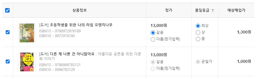 책의 정가가 같은지 아닌지를 표시하면 되는데, 대부분 같기 떄문에 크게 신경안써도 된다.
