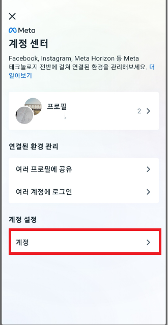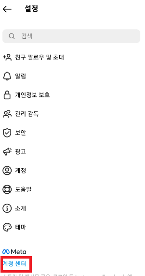 쭉 내리면 Meta라고 적힌 곳의 [계정 센터]를 눌러주자.