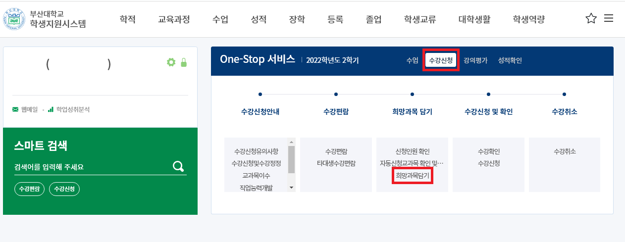 우선 학생지원시스템에 들어가 로그인을 한 다음 우측 파란 배너에서 [수강신청]을 클릭한 뒤 [희망과목 담기] 목록에서 [희망과목담기]를 눌러주자.