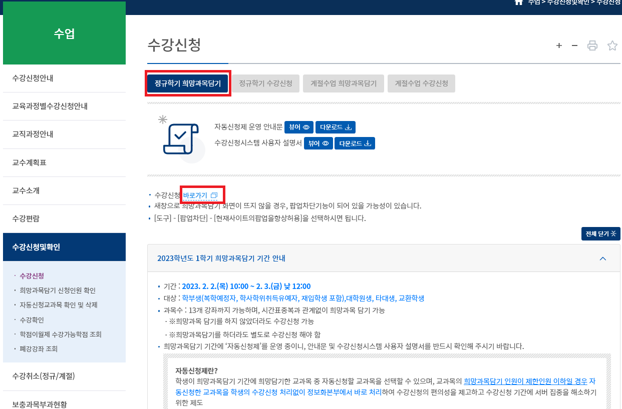 그러면 수강신청글이 뜨는데, [정규학기 희망과목담기]가 눌러져 있는 것을 확인한 뒤, 아래 [바로가기]를 누르면 된다.