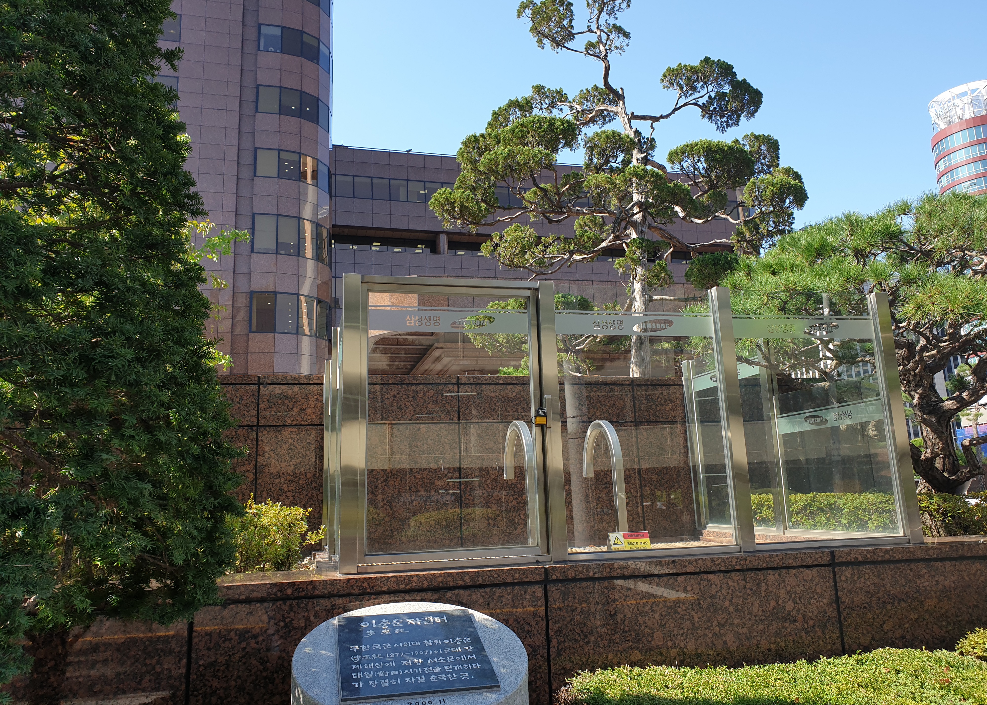 이 소식에 분노한 시위대는 봉기를 일으켰는데(남대문 전투) 그 때 체포되기 직전인 이충순도 서소문 안쪽(지금의 (구)삼성생명 인근)에서 자결합니다. 그리고 참군인이었던 그의 애국정신을 기념하기 위해 그가 자결한 곳에 기념비가 세워졌습니다.