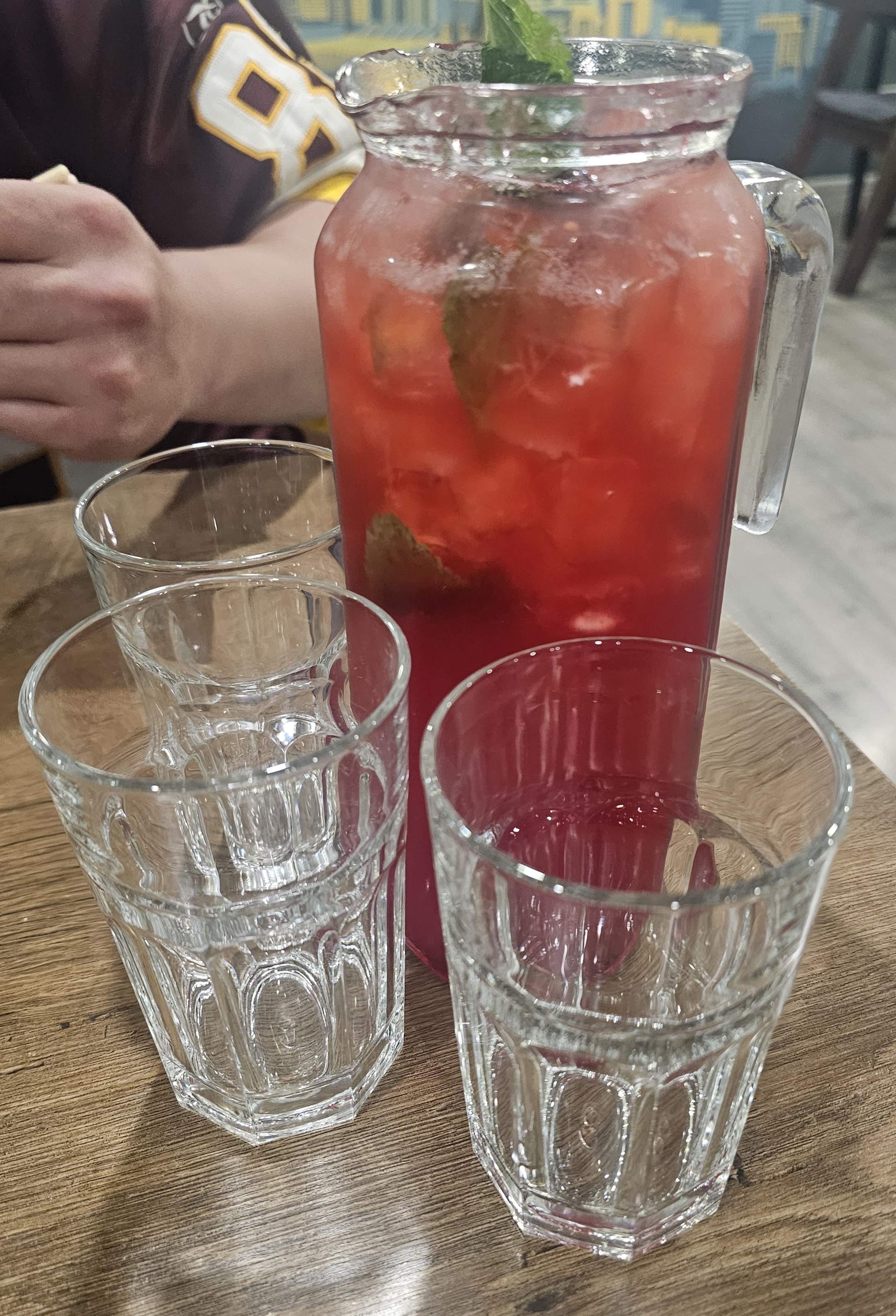 트로피컬레몬에이드(200솜, 25.06.04. 기준, 약 3112.84원)와 베리레몬에이드 1L(320솜, 25.06.04. 기준, 약 4980.544원)입니다. 얼음이 동동 들어간 시원한 레몬에이드입니다. 트로피컬레몬에이드는 새콤달콤한 맛, 베리믹스레몬에이드는 달달한 맛입니다. 개별적인 음료 종류 말고 보통의 식당 음료 자체의 가격은 한국과 비슷한 편입니다.