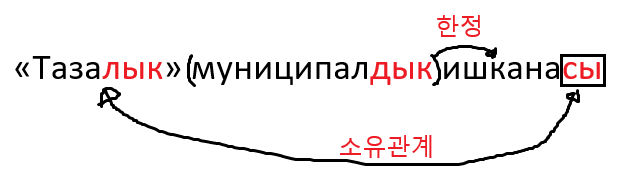 ишкана가 3인칭 단수 소유형으로 표현된 이유는 바로 기업 이름의 역할로 고유명사가 되어버린 3인칭 단수 명사인 'Тазалык'의 '회사'이기 때문이죠.