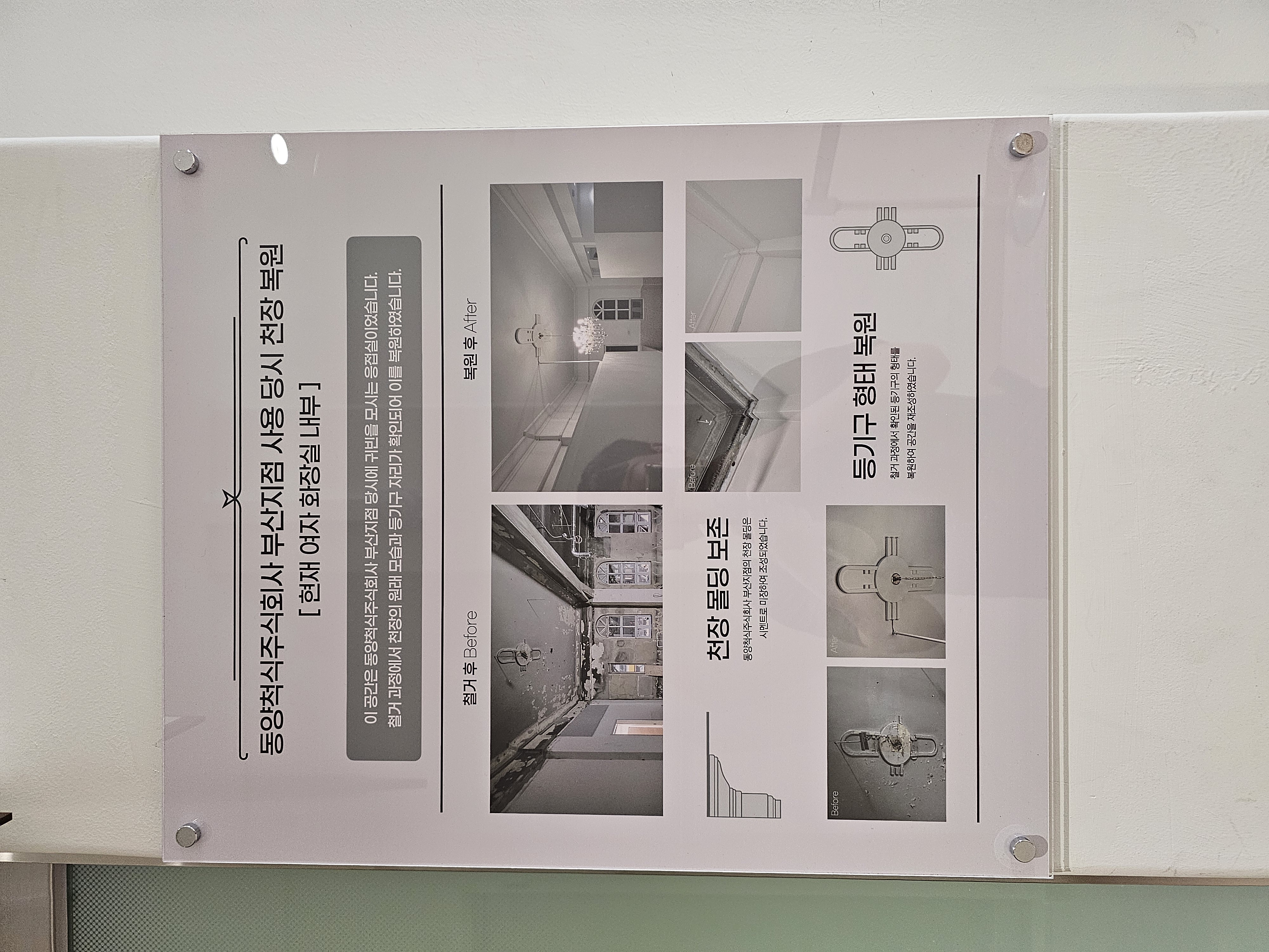 동양척식주식회사 부산지점 당시 귀빈을 모셨던 응접실의 천장 원래 모습과 등기구 자리가 철거 과정에서 확인됨에 따라, 지금의 여자화장실 내부에는 시멘트로 미장해 조성된 동양척식주식회사 부산지점의 천장 몰딩과 등기구의 형태를 복원하여 공간을 재조성 했다고 합니다.