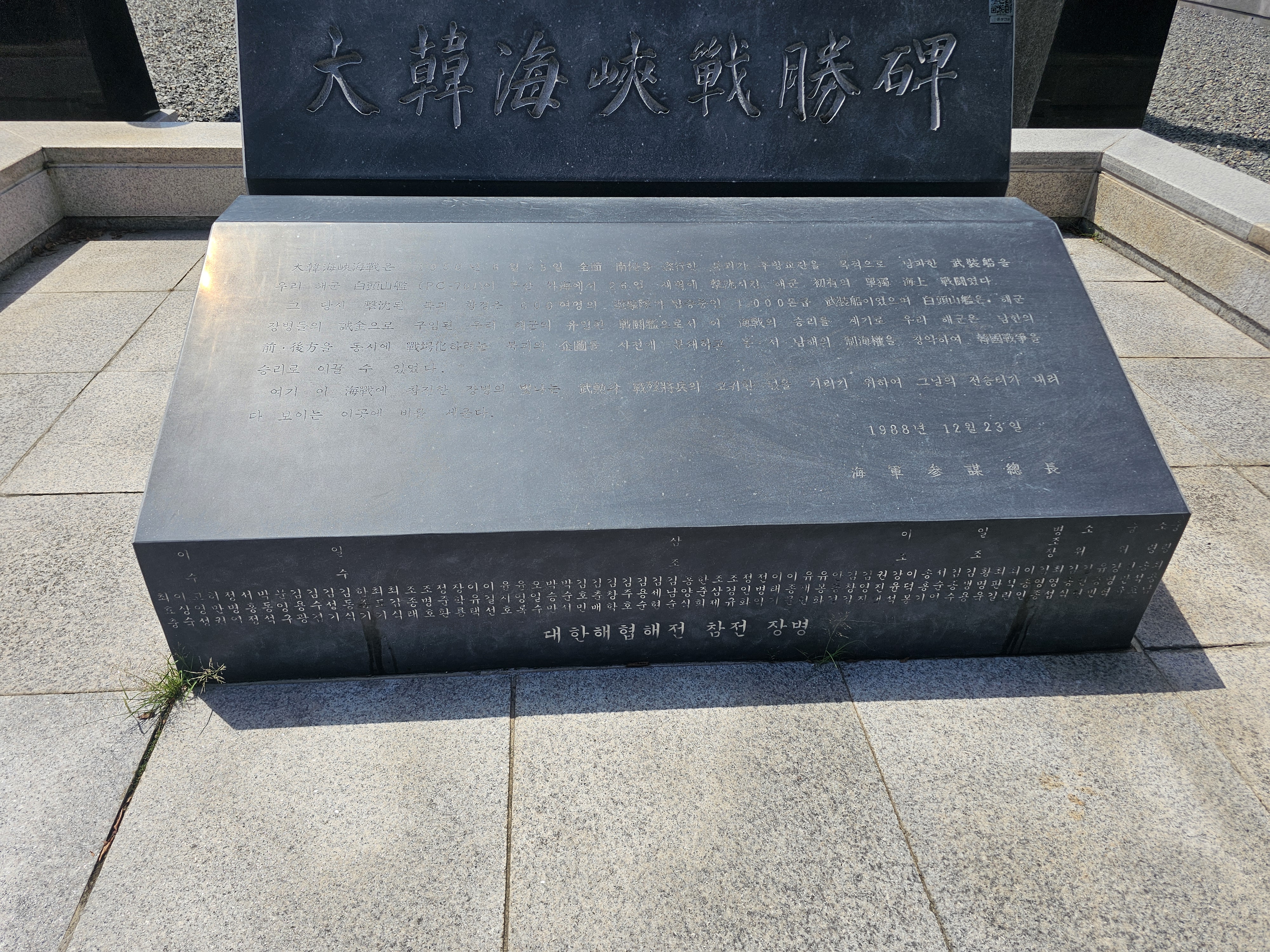 | 대한해협해전은 1950년 6월 25일 전면 남침을 자행(恣行)한 북괴가 후방교란을 목적으로 남파한 무장선을 우리 해군 백두산함(PC-701)이 부산 외해(外海)에서 26일 새벽에 격침시킨 해군 초유의 단독 해상 전투였다. 르 당시 격침된 북괴 함정은 800여명의 유격대가 탑승중인 1000톤급 무장함이었으며 백두산함은 해군 장병들의 성금(誠金)으로 구입된 우리 해군의 유일한 전투함(戰鬪艦)으로서 이 해전의 승리를 계기로 우리 해군은 남한의 전후방을 동시에 전장화하려는 북괴의 기도(企圖)를 사전에 분쇄하고 동서남해의 제해권을 장악하여 한국전쟁을 승리로 이끌 수 있었다. 여기 이 해전에 참전한 장병의 빛나는 무훈(武勳, 무공)과 전몰장병(戰歿將兵)의 고귀한 넋을 기리기 위하여 그날의 전승터가 내려다 보이는 이곳에 비를 세운다. |