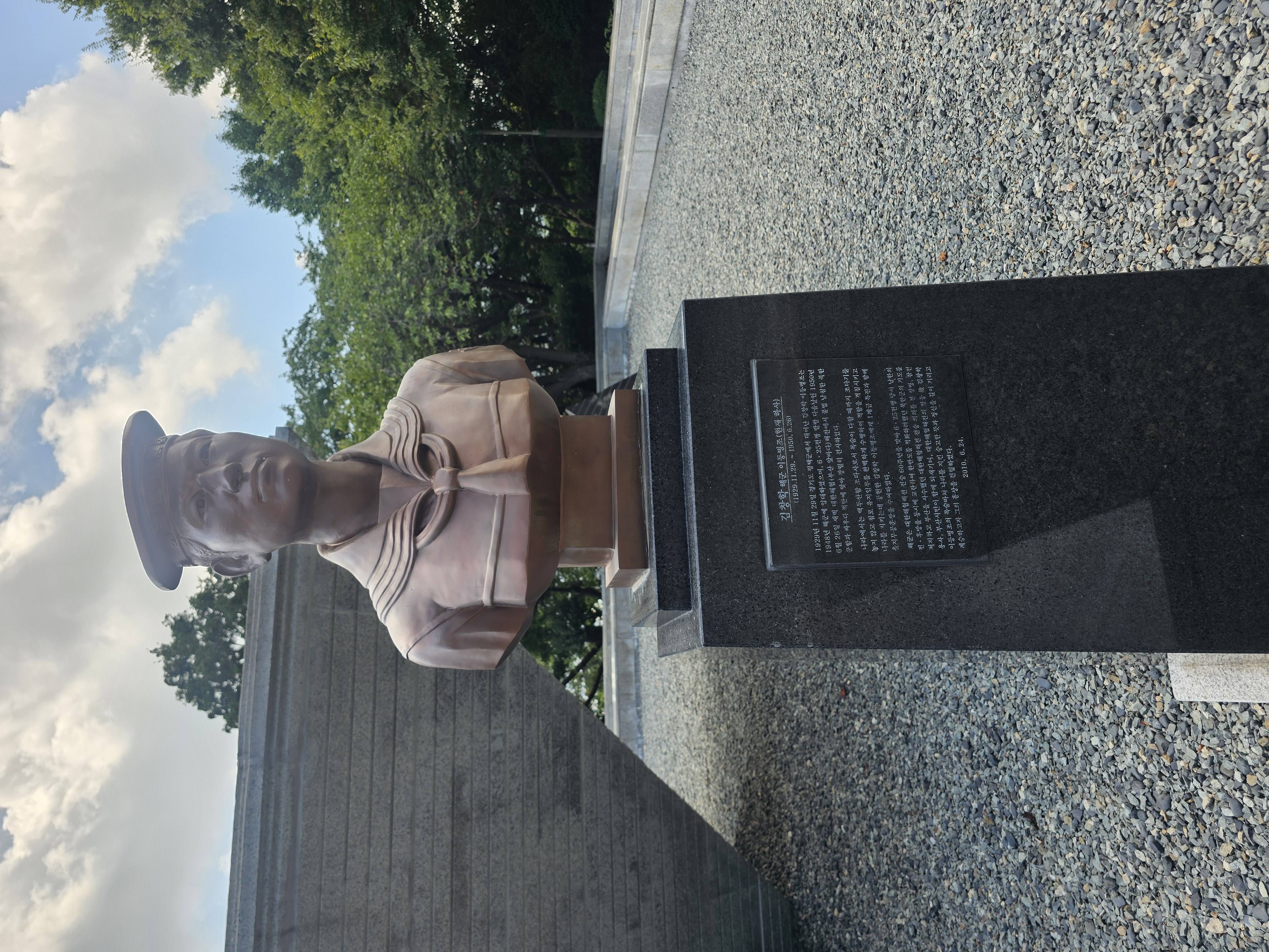 | 1929년 11월 29일 경기도 평택군에서 태어난 김창학 이등병조는 1948년 해군에 입대하였으며 6.25전쟁 발발 다음날인 1950년 6월 26일 새벽 대한해협(부산 앞바다) 해전에서 불법 남침한 북한 군함과 싸우다 적탄에 맞아 장렬히 전사하였다. 나라에서는 백두산함 조타사로서 목숨이 다할 때까지 조타기를 놓지 않고 침로 유지임무를 완벽하게 수행하여 적함을 격침시키고 나라를 지키는데 공헌한 김창학 일등병조에게 1계급 특전과 함께 을지무공훈장을 수여하였다. 해군은 대한해협 전승 60주년을 맞아 6.25전쟁 당시 남한의 전후방을 동시에 교란하여 한반도를 적화하려했던 북한군의 기도를 저지하고 부산을 사수했던 대한해협해전 전승 의의를 전 장병, 참전용사, 부산시민이 함께 되새기며, 대한해협해전의 영웅 고 김창학 이등병조의 목숨바쳐 나라를 지킨 숭고한 뜻과 정신을 길이 기리고 계승하고자 그의 흉상을 건립하였다. |