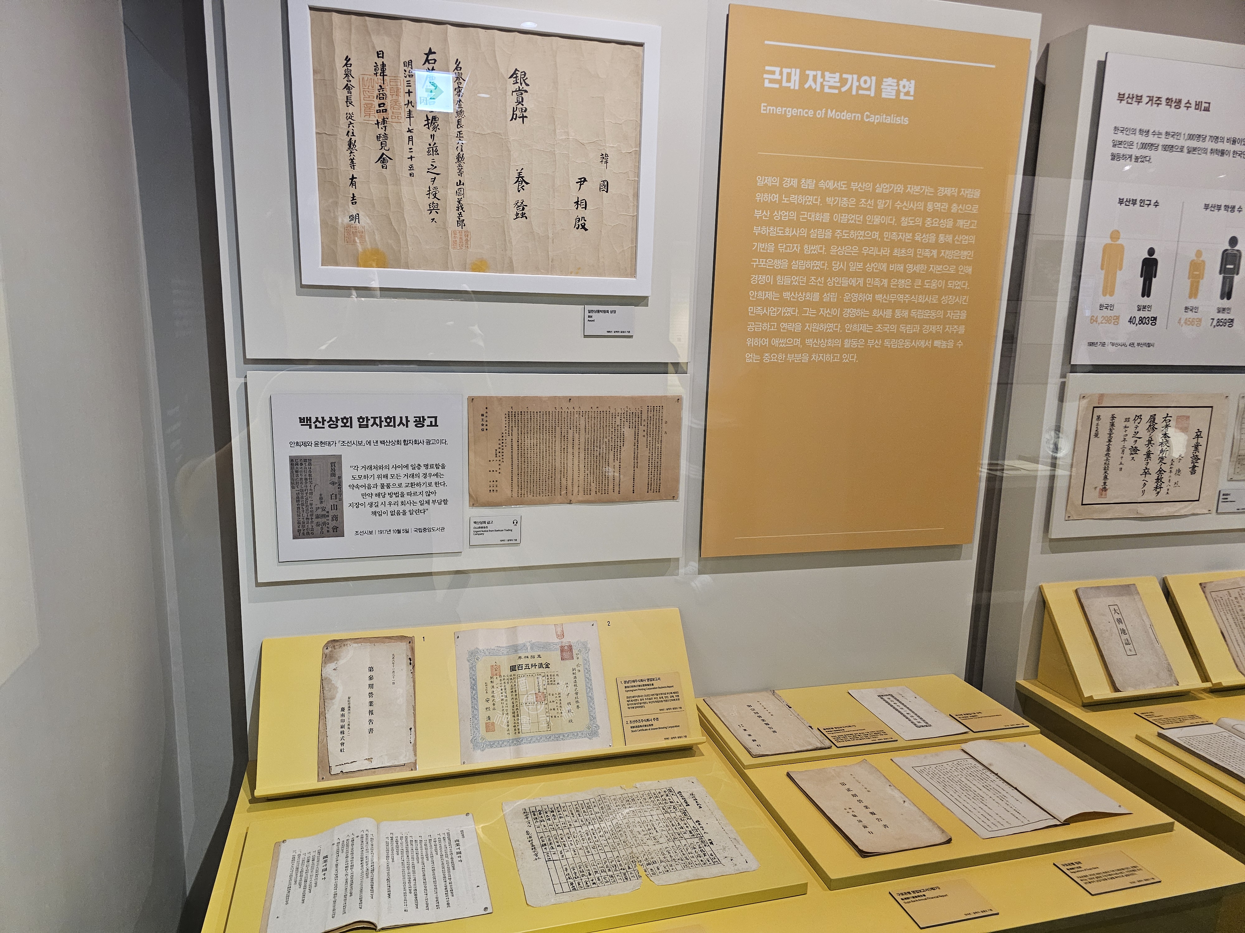 일본이 침략 목적으로 근대화를 시켰다면 일제강점기 부산인들은 자주적으로 민족 실력을 양성하고 자주적 근대화를 이루기 위하여 부단히 노력했죠. 그렇게 한국인 학생 수가 늘게되었고, 그 결과 일제의 경제 침탈 속에서도 부산의 실업가와 자본가들의 경제적 자립을 위하여 노력하는데 큰 도움을 줍니다. 그렇게 구포은행, 백산상회와 백산무역주식회사 등이 등장하게 됩니다.