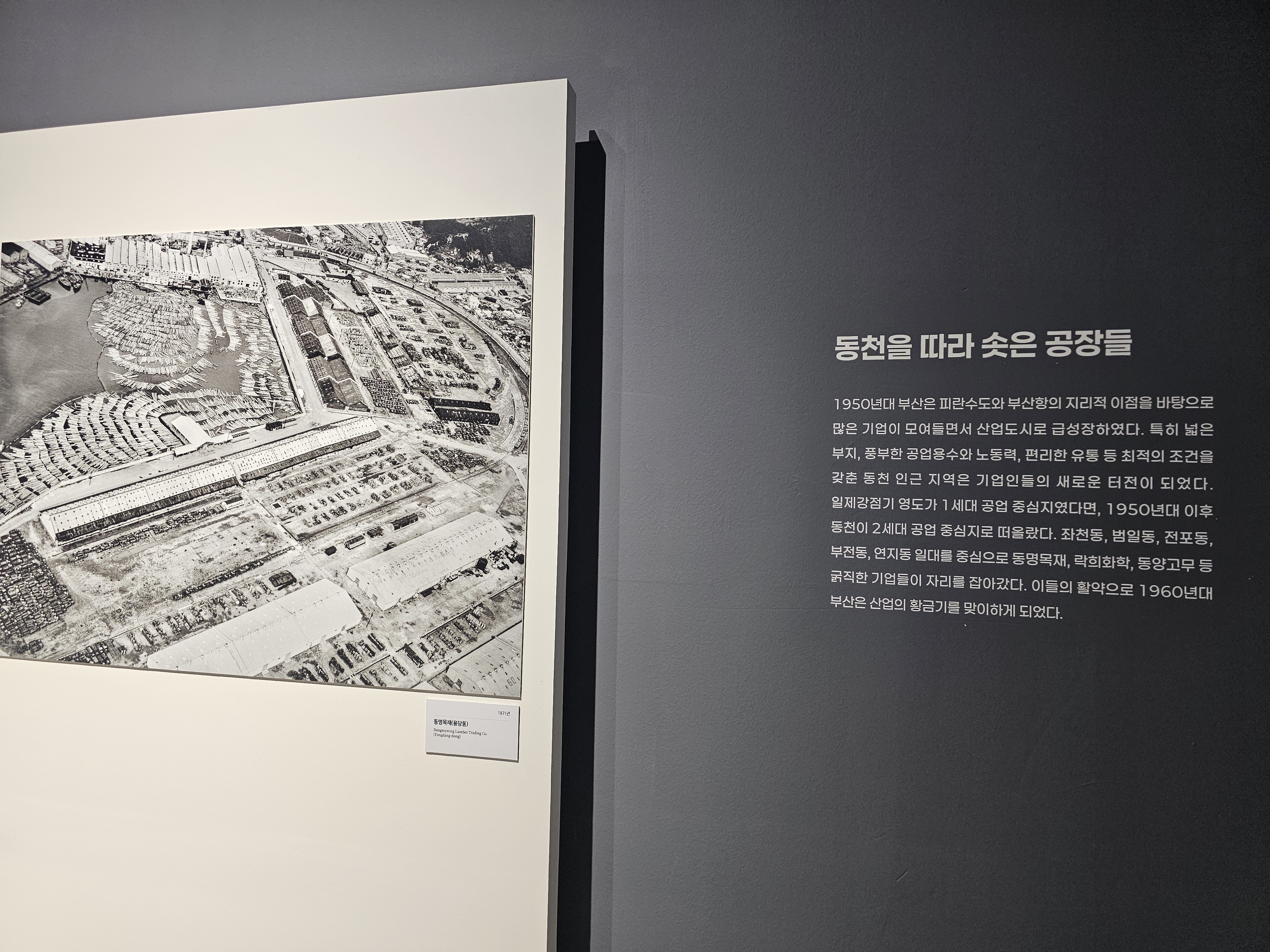 일제강점기에는 영도가 1세대 공업 중심지였으나 1950년대 이후 동천 지역이 2세대 공업 중심지로 떠올랐고, 그렇게 좌천동, 범일동, 전포동, 부전도 , 연지동 일대를 중심으로 동명목재상사(1949-1980), 락희화학공업사(1947-1974, (현) LG화학), 동양고무산업(1957-1989, (현) 화승) 등 굵직한 부산 기업들이 자리를 잡아갔고, 그들의 활약으로 1960년대 부산은 산업의 황금기를 맞이합니다.