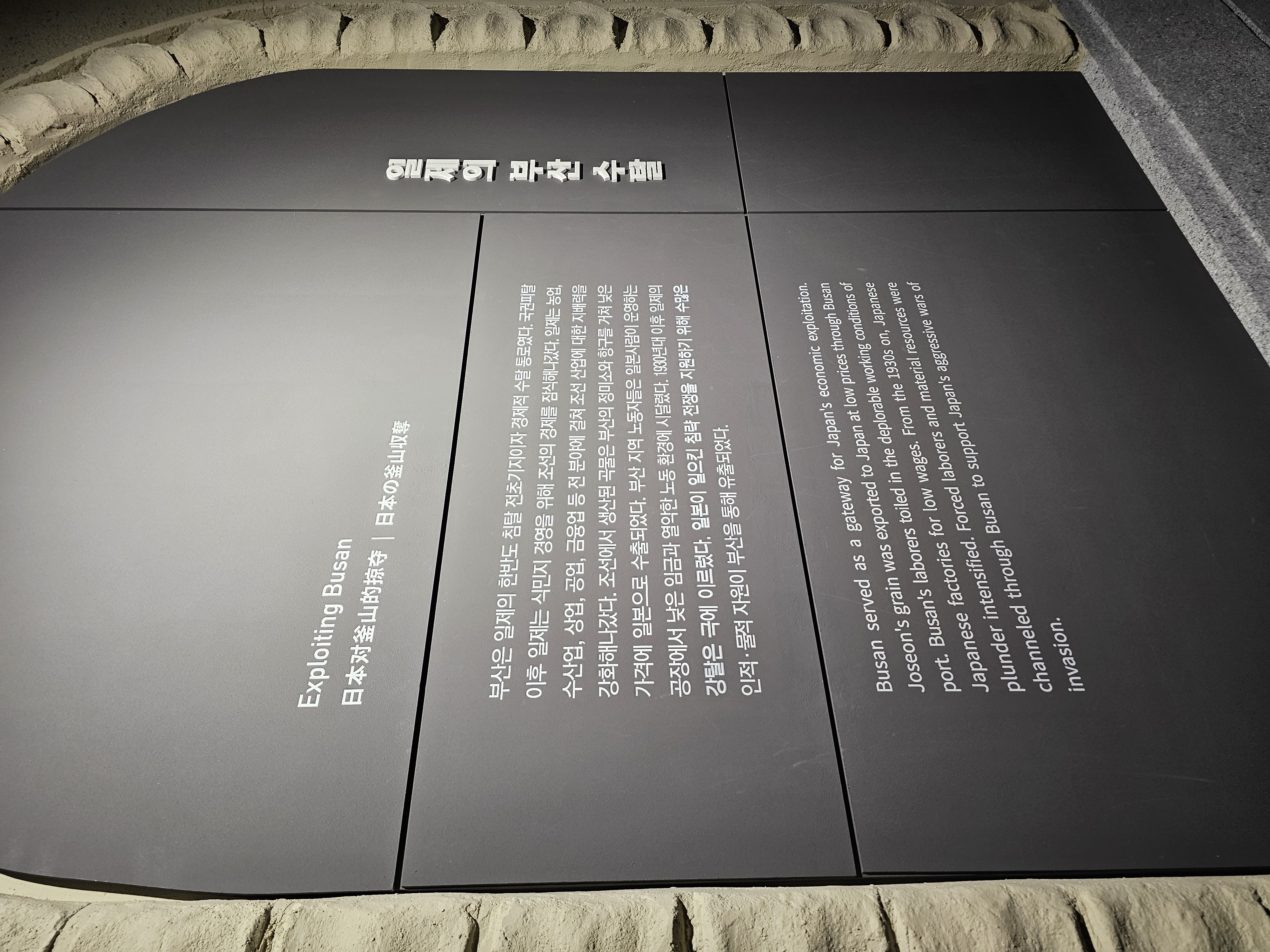 이제 본격적으로 일본이 부산에서 어떤 수탈을 했는지 살펴보게 됩니다. 동양척식주식회사로 부산의 땅을 빼앗았을 뿐 아니라 조선 곡물은 부산 정미소와 항구를 거쳐 낮은 가격에 일본으로 수출되었고, 부산 지역 노동자들은 일본인이 운영하는 공장에서 낮은 임금과 열악한 노동 환경에 시달렸죠. 1930년대 이후 일본이 전쟁을 계속하자 수많은 인적 물적 자원이 부산을 통해 유출됩니다.