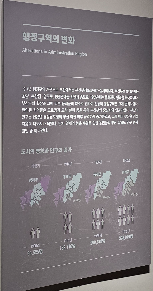 1914년 행정구역 개편으로 부산에서는 부산부제가 실시됩니다. 부산부는 1914년에는 초량, 부산진, 영도로, 1936년에는 서면과 송도로, 1942년에는 동래까지 영역을 확대했습니다. 부산부의 확대로 동래군은 축소되어 전통적 행정구역은 크게 변화되었죠. 특히 1925년 경상남도청의 부산 이전 이후 급격하게 인구가 증가했으며, 그에 따라 부산은 경성부((현)서울특별시) 다음의 대도시가 됩니다. 당시 일제의 농촌 수탈로 인한 농민들의 부산 유입도 인구 증가 원인 중 하나였다고 합니다.