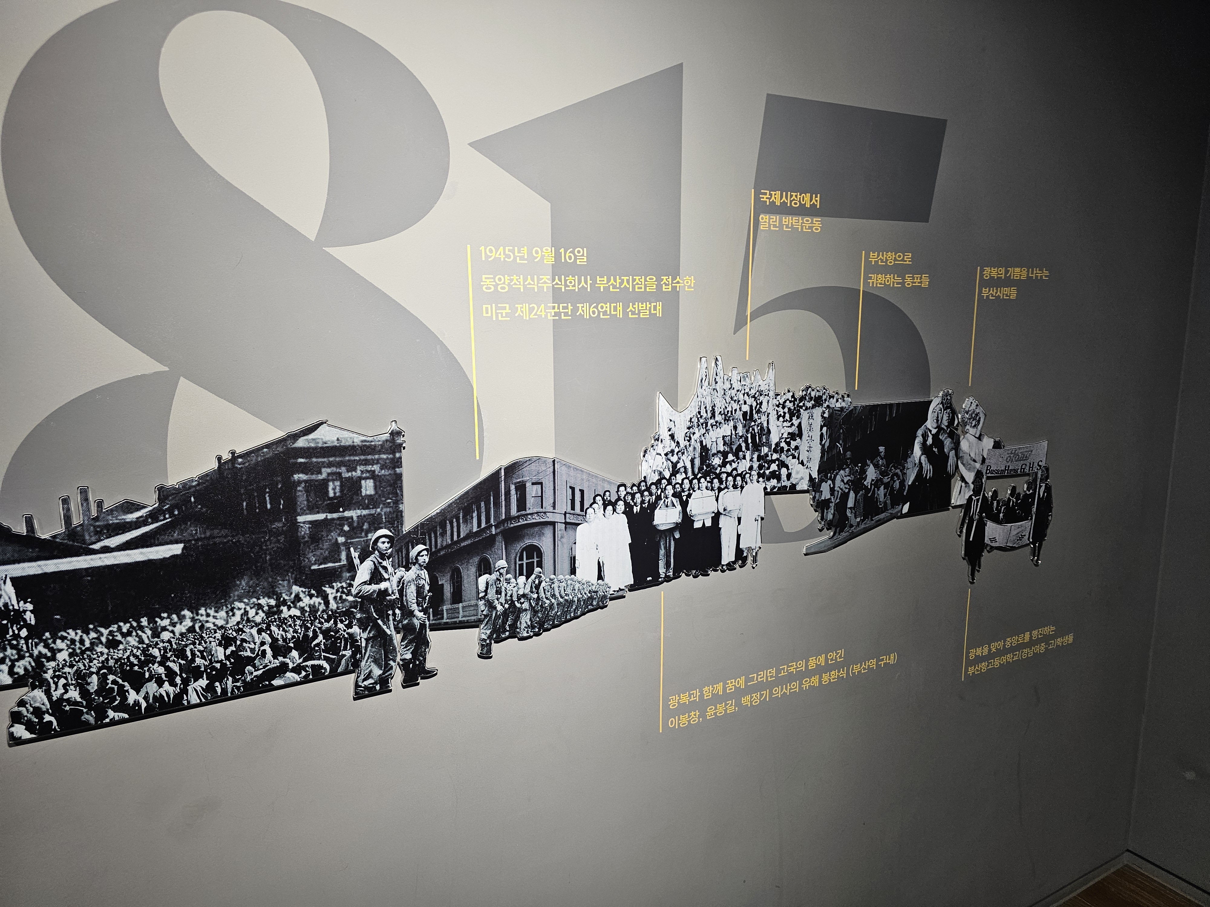 광복 직후 조직된 건국준비위원회와 산하 치안대는 일본인이 떠난 행정 공백을 메우고, 질서 회복과 치안 유지를 위해 노력했죠. 부산 지역의 각종 구호회는 귀국동포연합회로 통합되어 귀환 동포들의 임시 수용시설 제공, 교통편 알선 등의 편의를 제공했습니다. 이후 미군정이 들어서고, 한국전쟁이 시작되자 부산에 중요 정부기구, 미대사관, 유엔 주요 기관 등이 모여들며 전쟁 극복을 위한 중심지가 됩니다. 특히 대부분의 물자와 원조, 구호품이 부산항으로 들어왔기에 이런 준비들을 빠르게 할 수 있었죠.