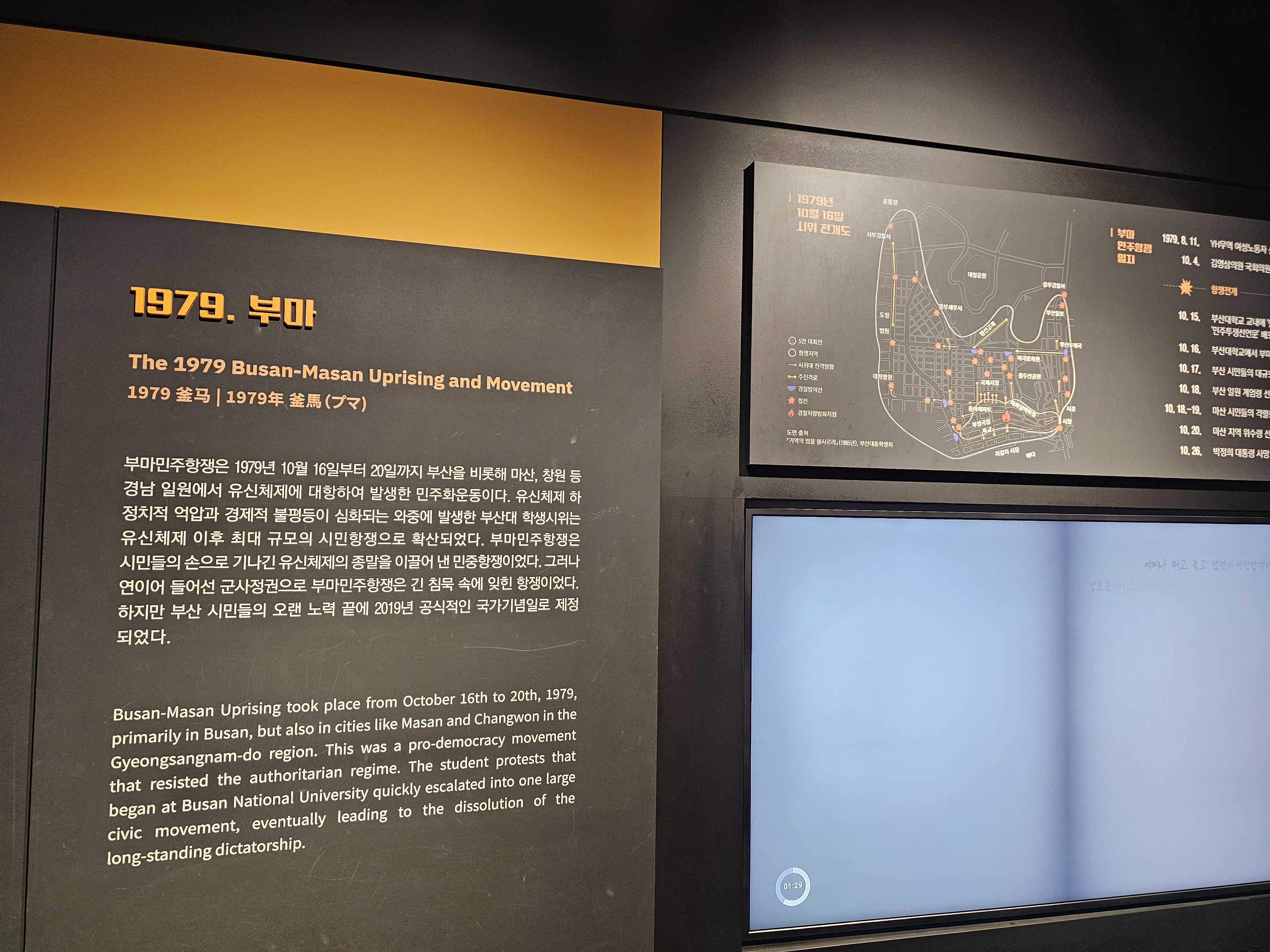 이승만 독재 정권과 부정선거에 항거한 4.19혁명(1960), 박정희 독재 정권을 무너뜨리는데 결정적인 역할을 한 부마민주항쟁(1979), 전두환 독재 정권을 무너뜨리는 6월 항쟁(1987) 등 부산에서도 있었던 민주주의 실현을 위한 민주화운동의 역사도 볼 수 있습니다.