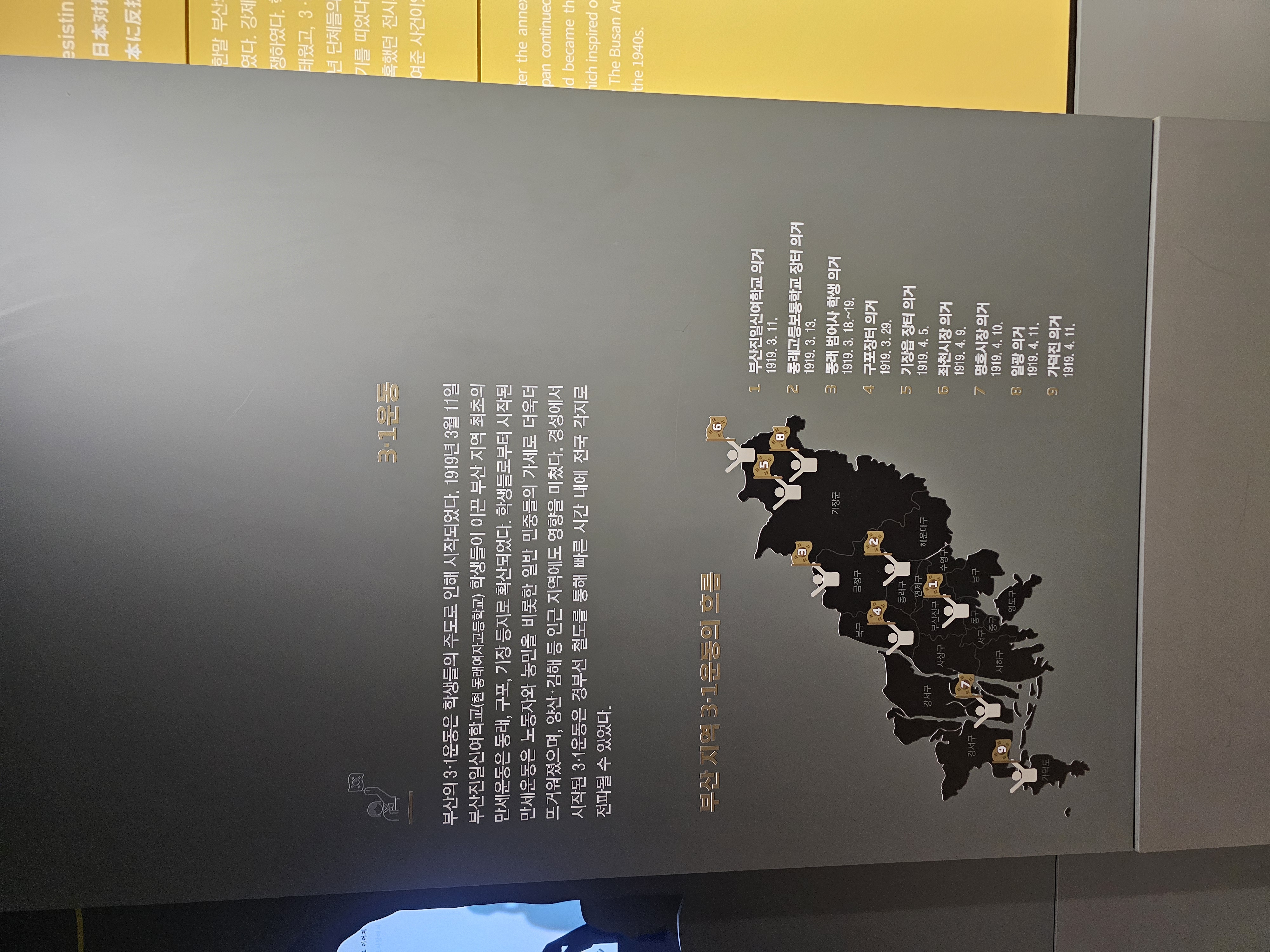 일제라는 수탈자에게 항쟁하기 위해 부산도 일어섰습니다. 1919년 3워 11일 부산진일신여학교((현)동래여자고등학교) 학생들이 이끈 부산 지역 최초의 만세운동은, 동래, 구포, 기장, 강서로 확산되어 학생들과 민중이 합세한 3.1만세운동의 물결이 펼쳐졌습니다. 그 뿐 아니라 1942년 부산진공립보통학교((현)부산진초등학교) 동창 5명과 함께 이광우(李光雨, 1925-2007)는 비밀단체를 조직해 일본 군수품을 제조하던 조선방직 파괴를 계획헀다가 경찰에 체포된 친우회 사건 등 부산 내에서 많은 독립운동도 있었죠.