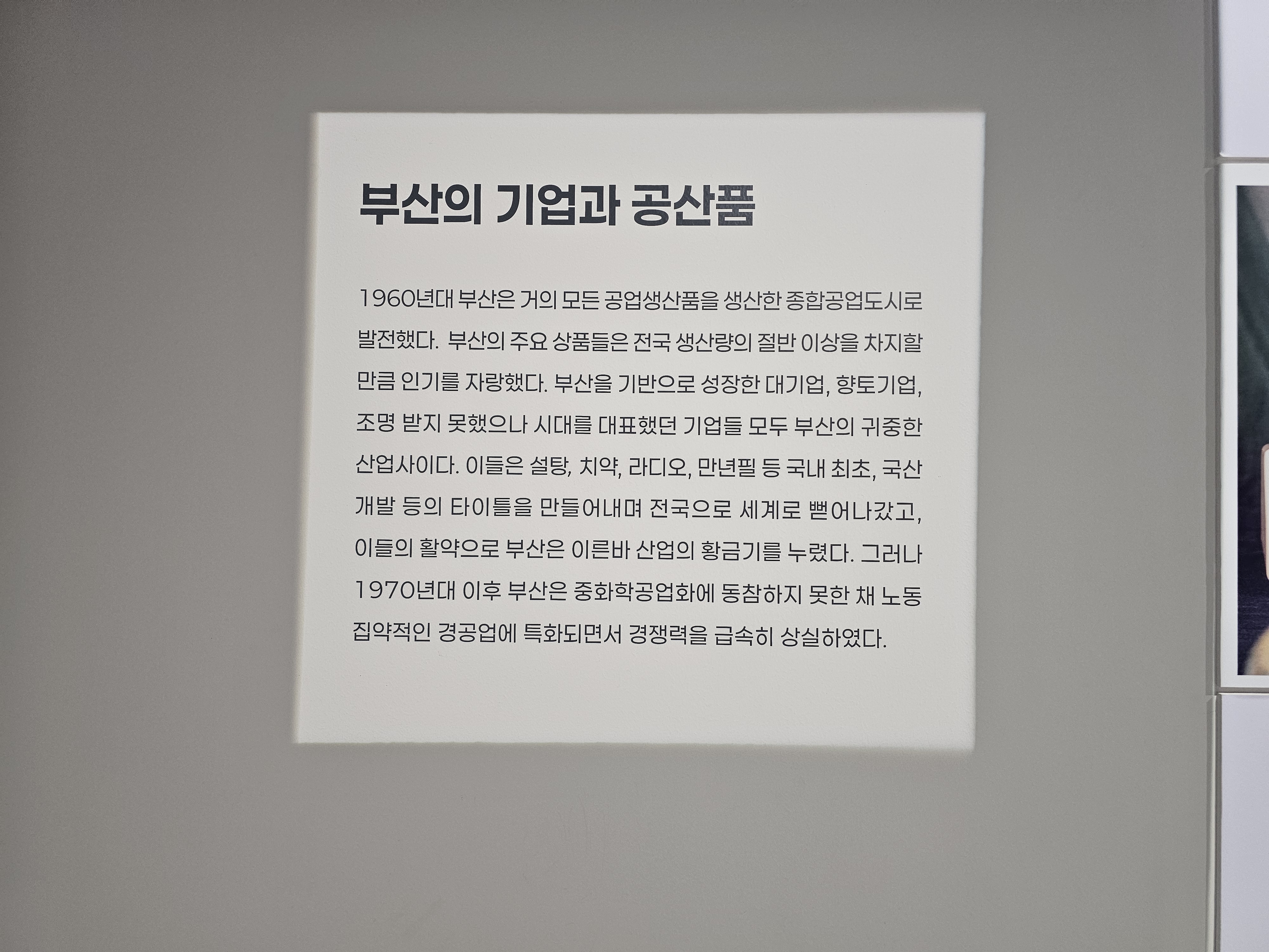 이런 전체적인 상황은 1960년대 부산이 거의 모든 공업생산품을 생산할 수 있는 종합공업도시로 발전하게 되는 계기가 되었습니다. 이곳에서 성장한 기업들은 국내 최초, 국산 개발 타이틀을 만들어내며 전국과 전세계로 뻗어나가며 산업의 황금기를 누리게 됩니다. 그러나 1970년대 이후 부산은 중화학공업화에 동참하지 못한 채 노동집약적인 경공업에 특화되면서 경쟁력을 급속히 상실하게 됩니다.