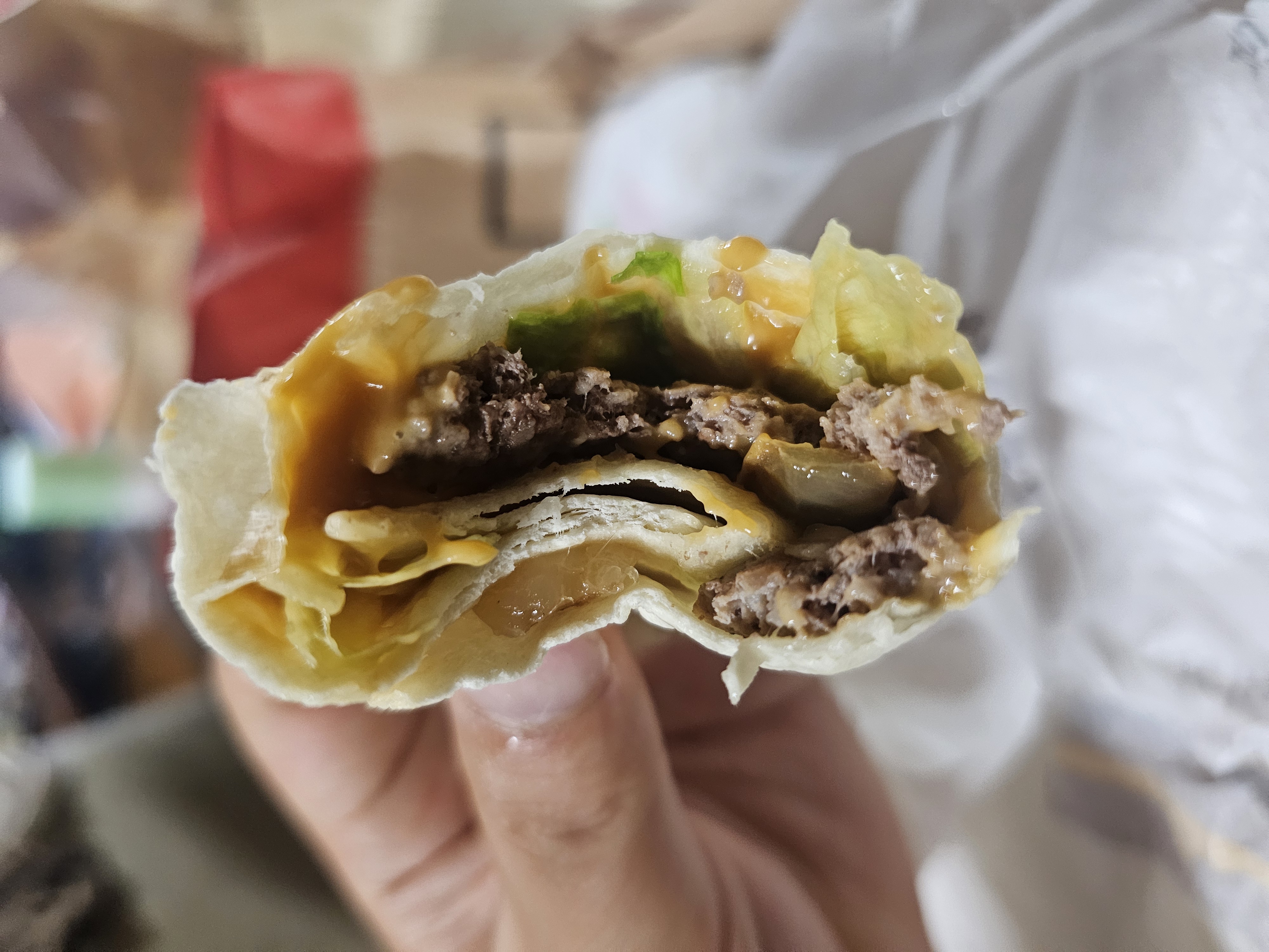 해피스낵뉴1955스낵랩(3000원)입니다. 1955버거의 맛을 그대로 담은 스낵랩인데요. 안에는 얇고 둥근 소고기패티와 구운양파, 양상추, 그리고 달달매콤한 소스가 들어가 있습니다. 1955버거 안에 있던 베이컨은 없는데, 맛있습니다.