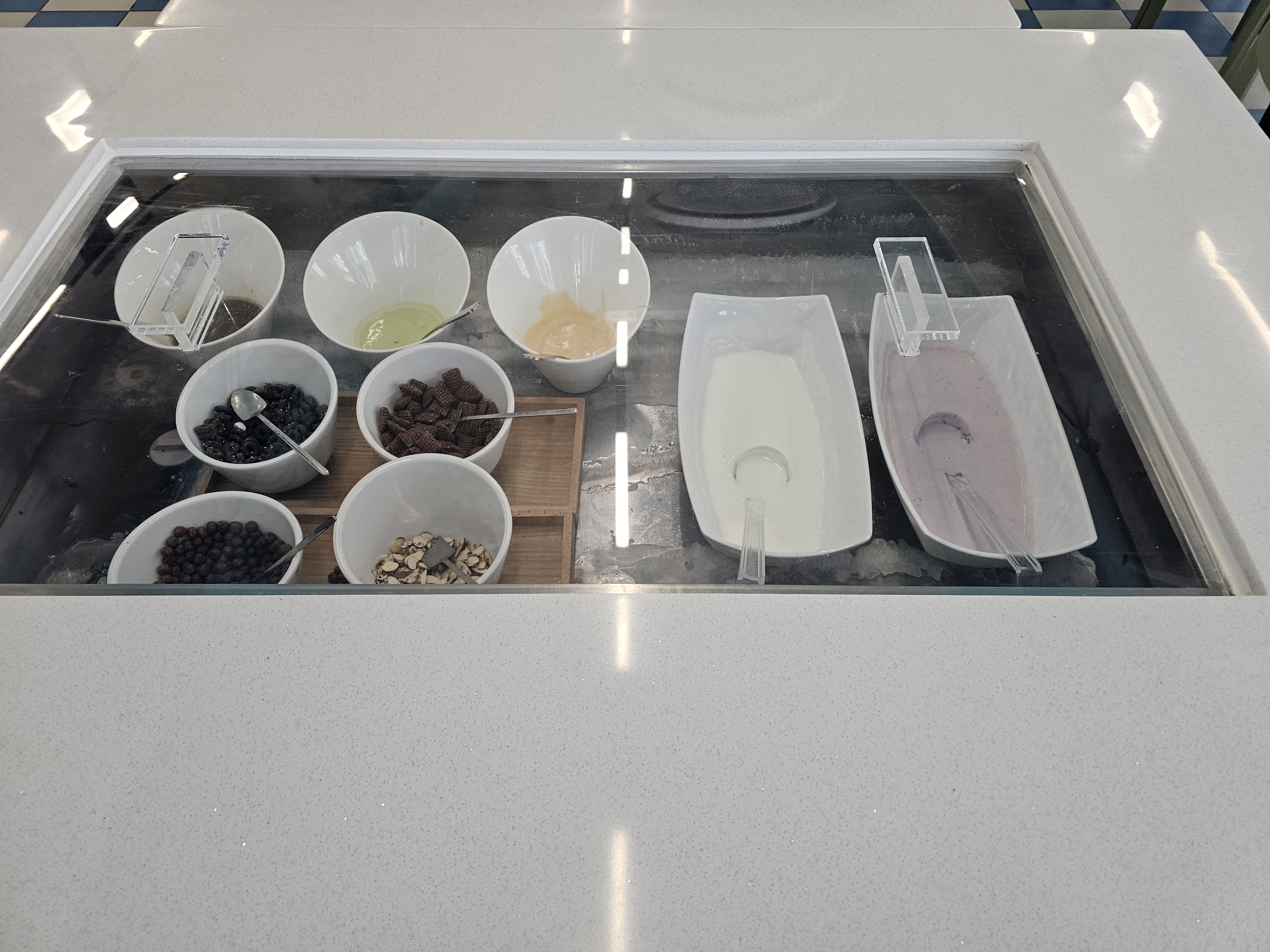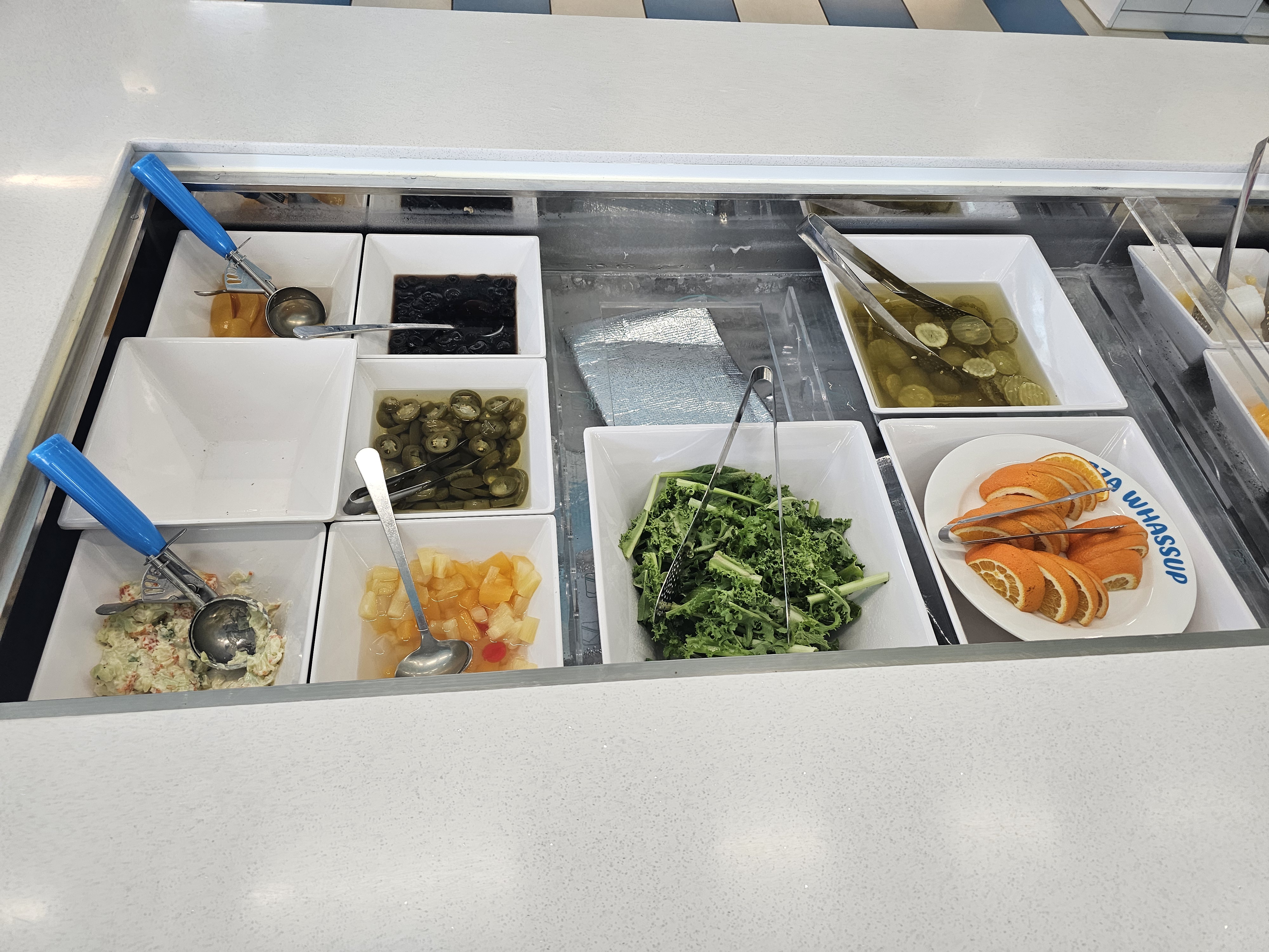 과일, 샐러드, 요거트 등 다양한 종류를 즐길 수 있는 샐러드바가 있습니다. 추가 비용을 내야 이용할 수 있는데, 피클은 샐러드바 비용 없이 이용하면 된다고 사장님이 말씀하셨어요.