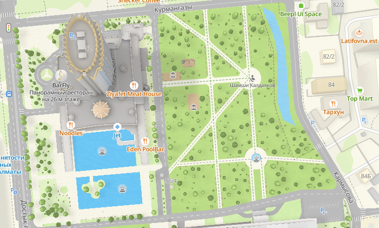카자흐스탄 알마티의 메데우구(Медеуский район)의 도스틱대로(Проспект Достык)의 호텔 카자흐스탄(Казахстан)을 잠시 방문하게 되었습니다. 호텔 안도 이쁘지만 바깥에도 낙타 벽화와 분수 그리고 카자흐스탄 작곡가 샴시 칼다야코프(Шамши Калдаяков)를 기리는 기념비가 있는 우정소공원(сквер Дружба)이 있으며, 그 공원의 동쪽으로 소알마틴카(Малая Алматинка)가 흐르고 있으니 산책해보시길 바래요~