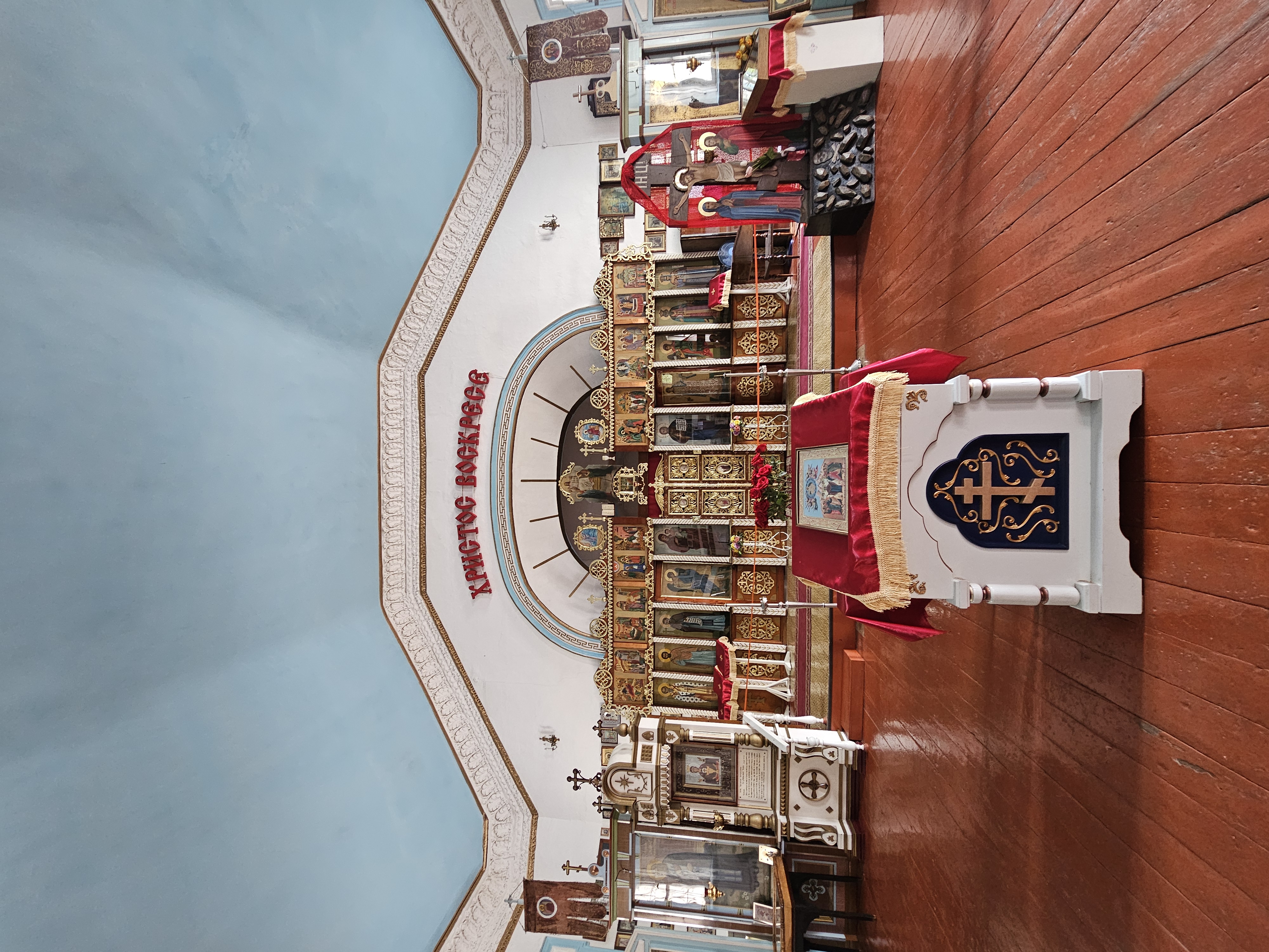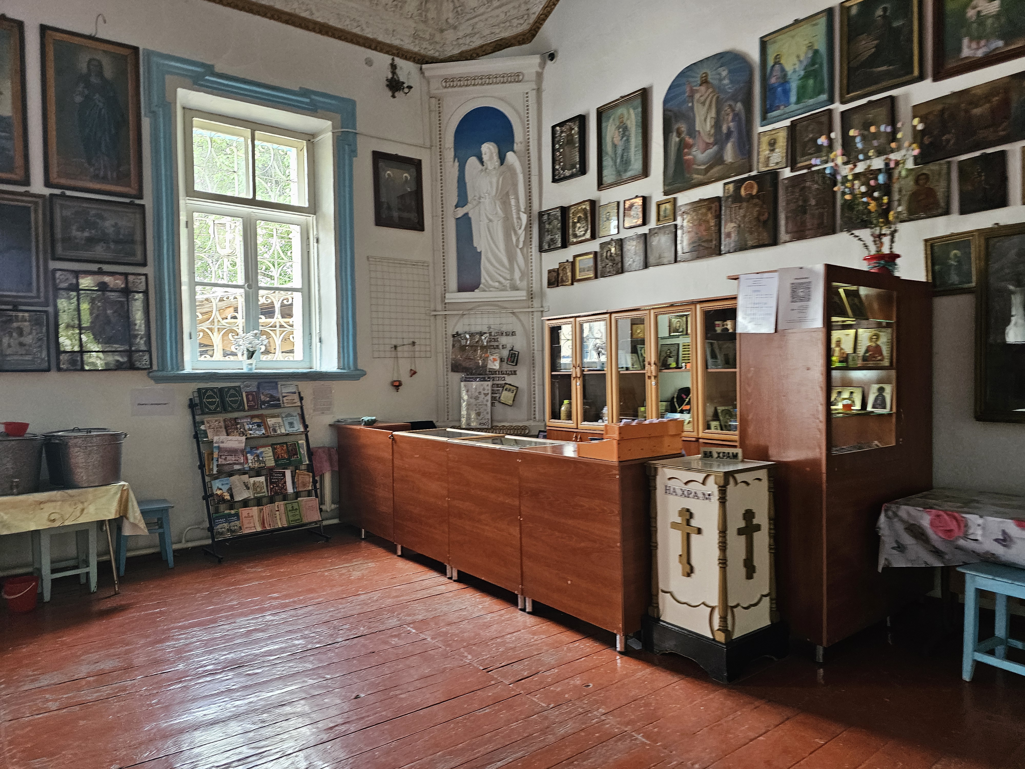 정교회에서 쓰이고 기념되는 다양한 휘장, 그림, 도구, 십자가들과 함께 앞으로 지어질 성당의 조감도 모형을 볼 수 있습니다.