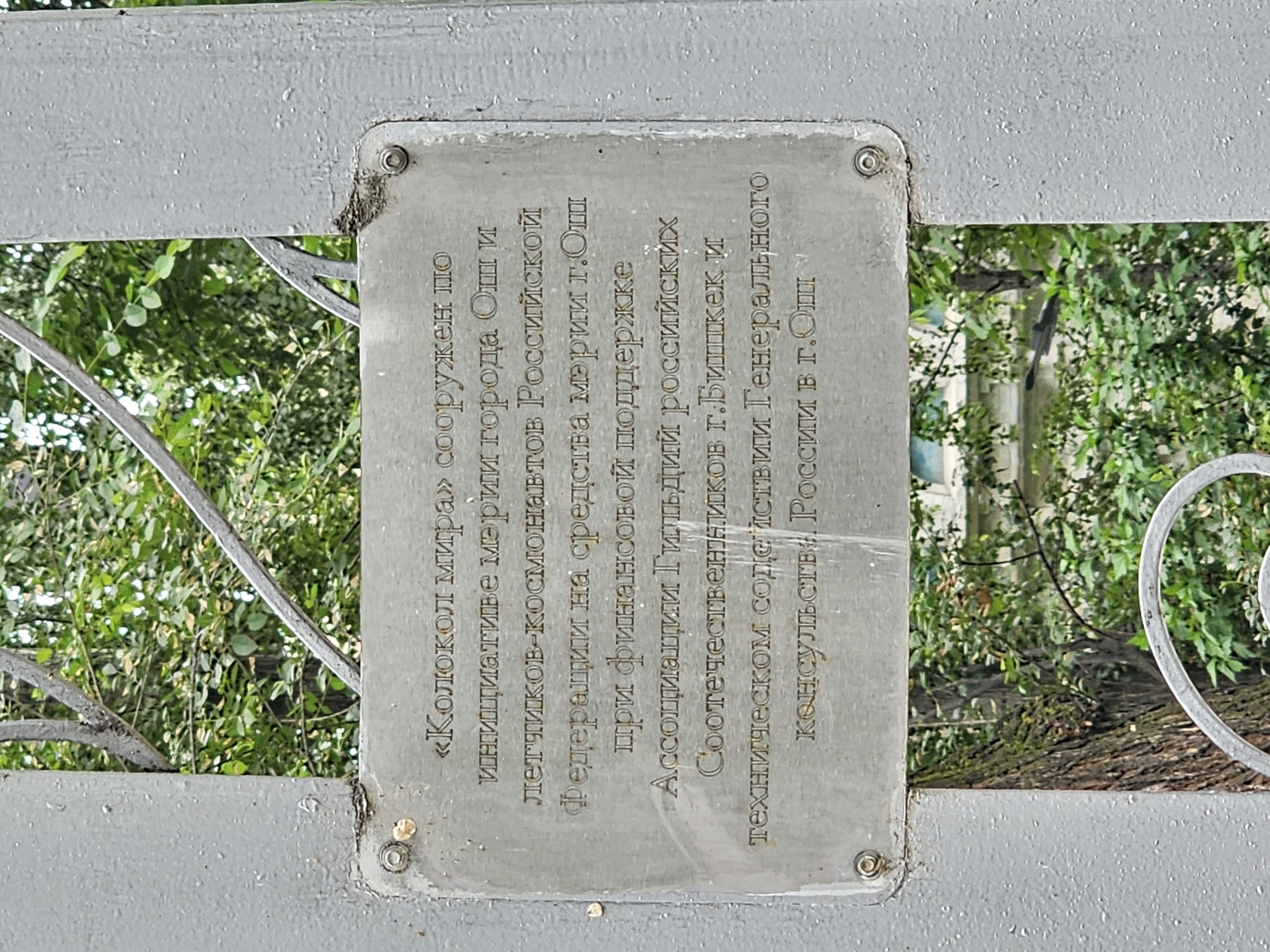 | «Колокол мира» сооружен по инициативе мэрии города Ош и летчиков-космонавтов Российской Федерации на средства мэрии г. Ош при финансовой поддержке Ассоциации Гильдий российских Соотечественников г. Бишкек и техническом содействии Генерального консульства России в г. Ош | «평화의 종»은 오시 시청과 러시아 연방 우주비행사들의 발의로 오시 시청의 자금과 비슈케크 러시아 동포 길드 협회의 재정 지원, 오.시 러시아 총영사관의 기술 지원으로 건립되었다 |